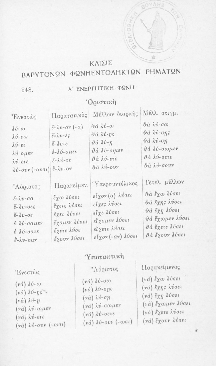 Μαθητικό βοήθημα Ε΄ και ΣΤ΄ Δημοτικού που περιέχει τη γραμματικής της απλής Καθαρεύουσας.