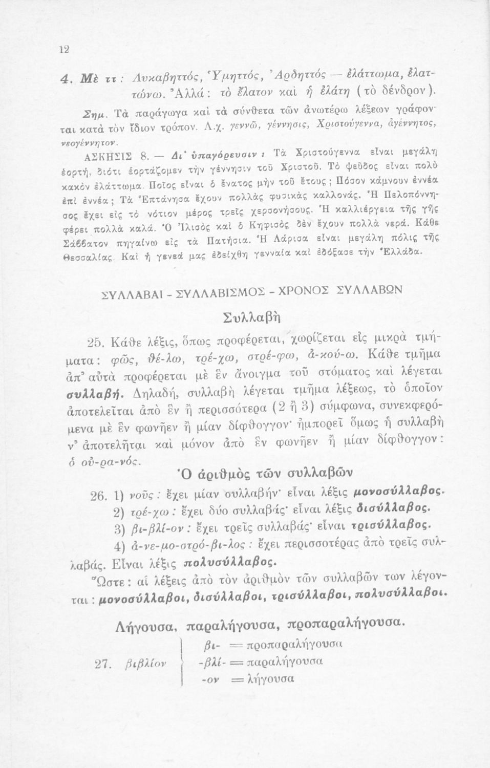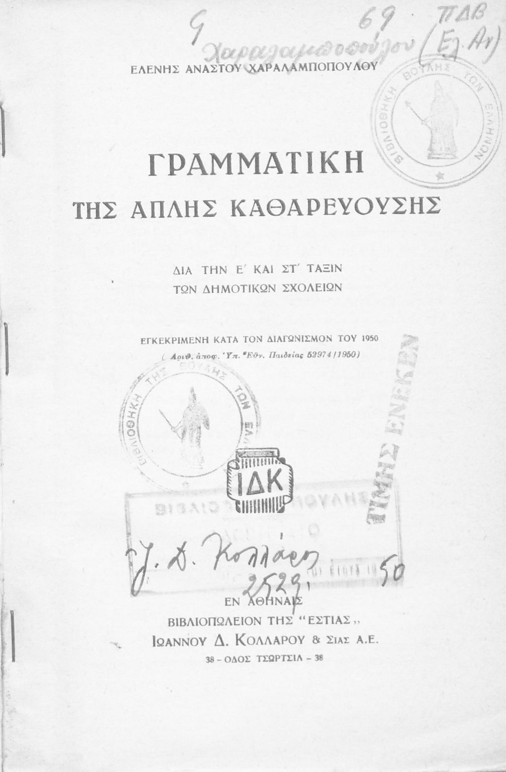Μαθητικό βοήθημα Ε' και ΣΤ΄ Δημοτικού που περιλαμβάνει τους κανόνες γραμματικής και συντακτικού της καθαρεύουσας.