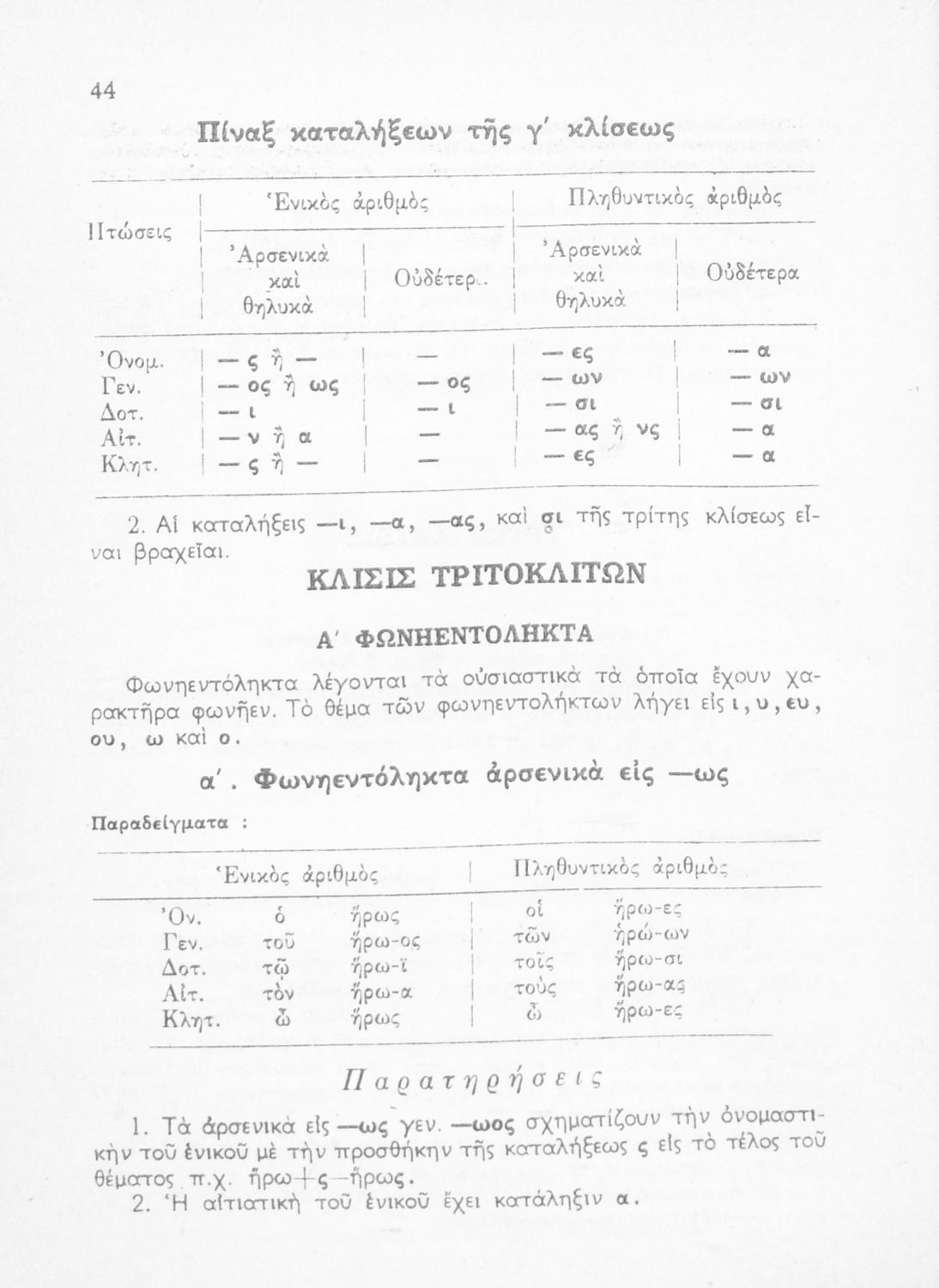 Σχολικό εγχειρίδιο που περιλαμβάνει τη γραμματική της αρχαίας ελληνικής, λεξικό ρημάτων και τους βασικότερους κανόνες του συντακτικού.