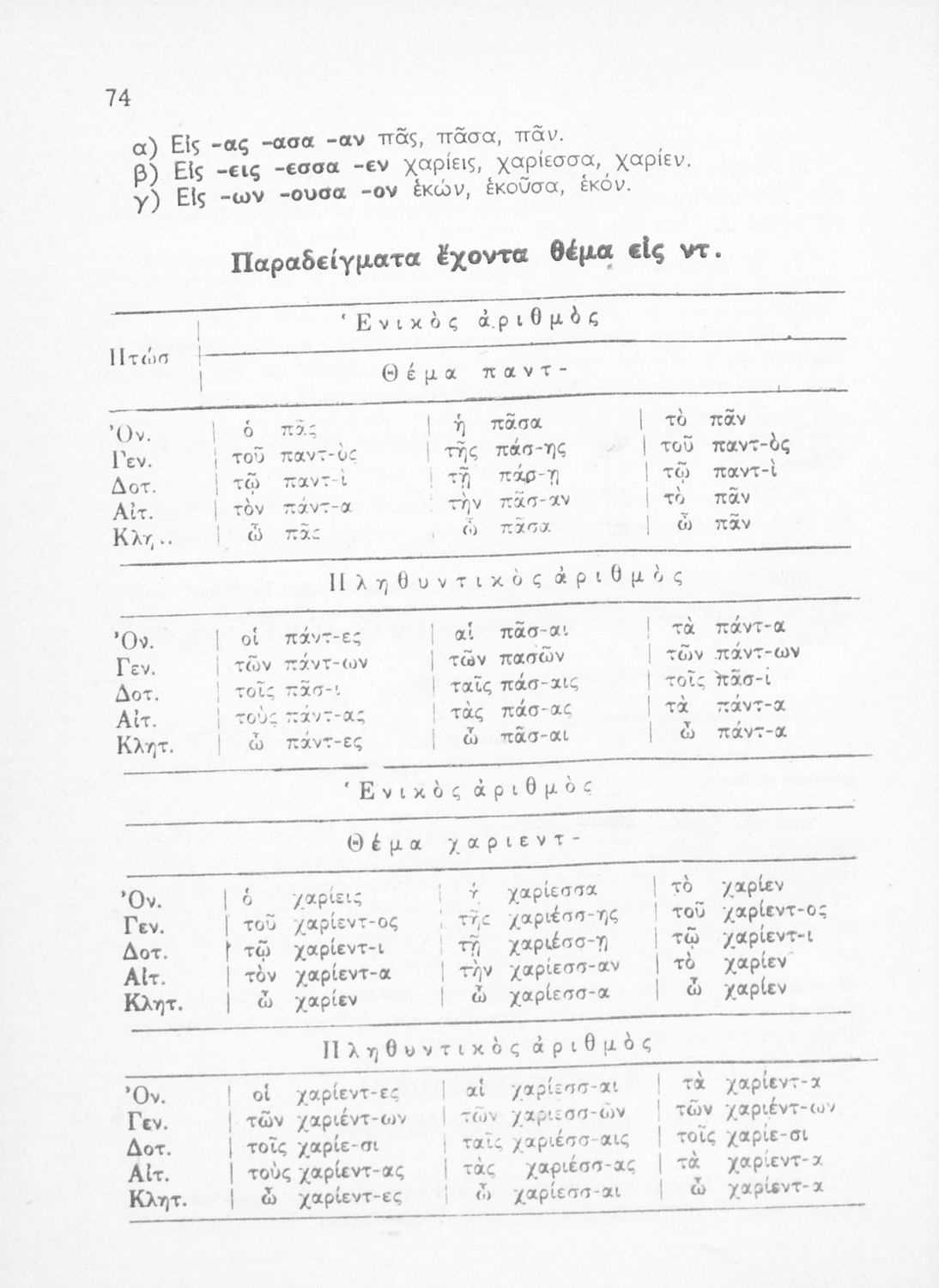 Σχολικό εγχειρίδιο που περιλαμβάνει τη γραμματική της αρχαίας ελληνικής, λεξικό ρημάτων και τους βασικότερους κανόνες του συντακτικού.