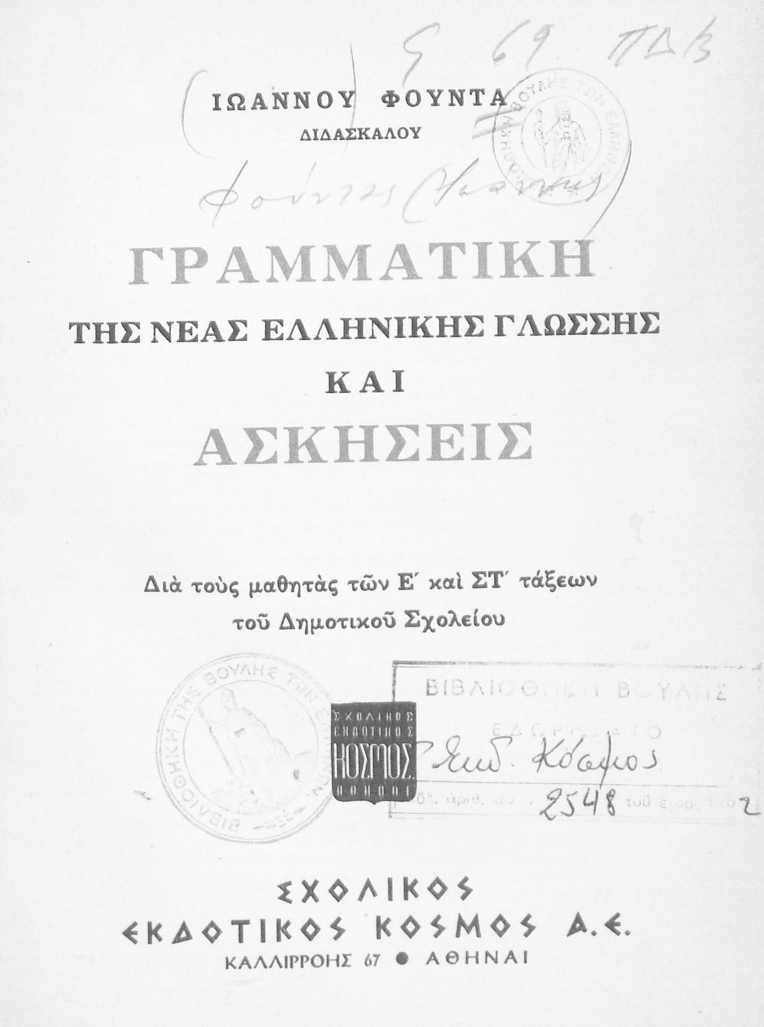 Τίτλος: Γραμματική της Νέας ελληνικής γλώσσης και Ασκήσεις. Δια τους μαθητάς της Ε΄ και ΣΤ΄ τάξης Δημοτικού Σχολείου
