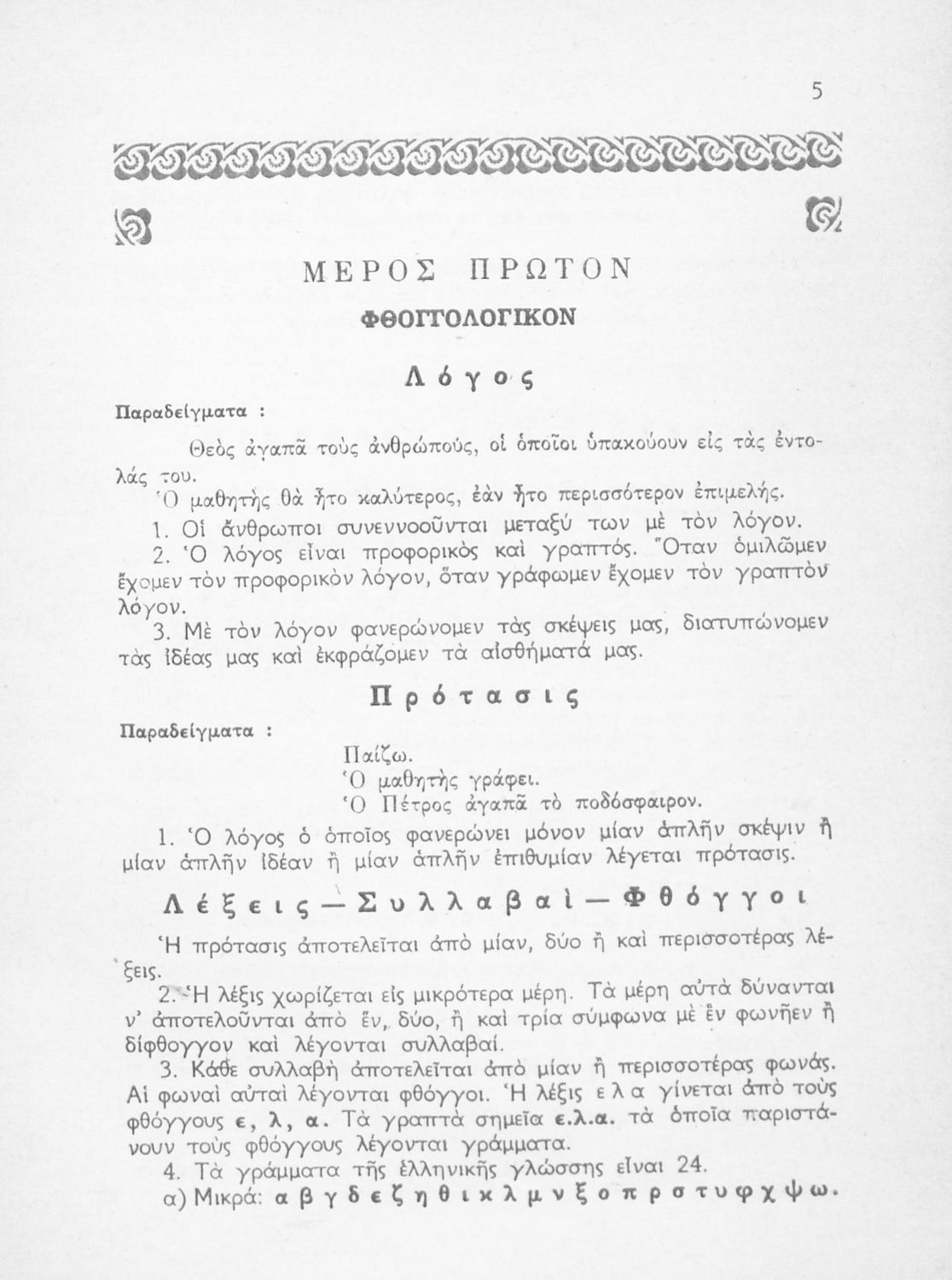 Σχολικό εγχειρίδιο γραμματικής για τους μαθητές της Ε΄ και ΣΤ΄ τάξης του Δημοτικού. Περιέχει τη διδασκαλία της γραμματικής της καθαρεύουσας με κανόνες και παραδείγματα.