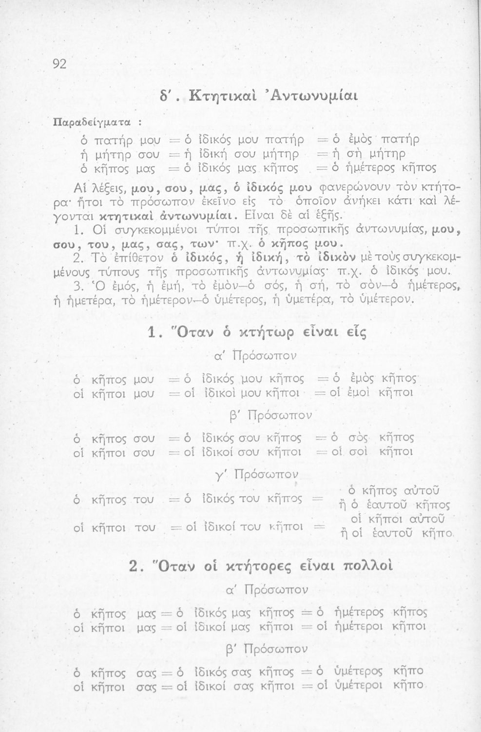 Σχολικό εγχειρίδιο γραμματικής για τους μαθητές της Ε΄ και ΣΤ΄ τάξης του Δημοτικού. Περιέχει τη διδασκαλία της γραμματικής της καθαρεύουσας με κανόνες και παραδείγματα.