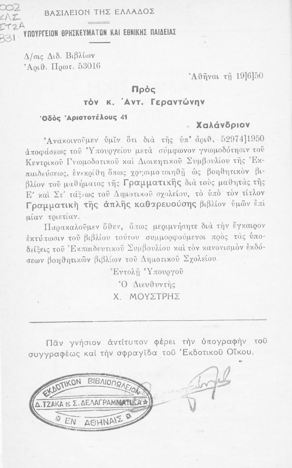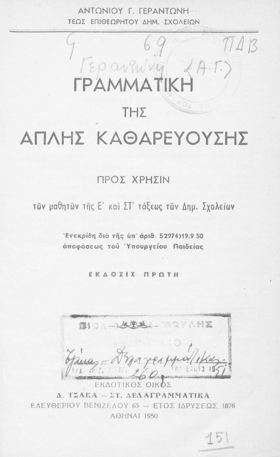 Εκδότης: Δημ. Ν. Τζάκας, Στεφ. Δελαγραμμάτικας Έτος έκδοσης: 1950 Τόπος έκδοσης: Αθήνα Έκδοση: 1η Υπουργική απόφαση / Σύμβαση: 53016/19-6-1950 Έτος έγκρισης: 1950 |