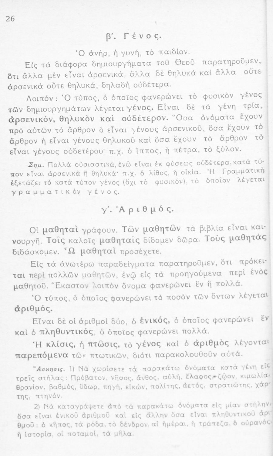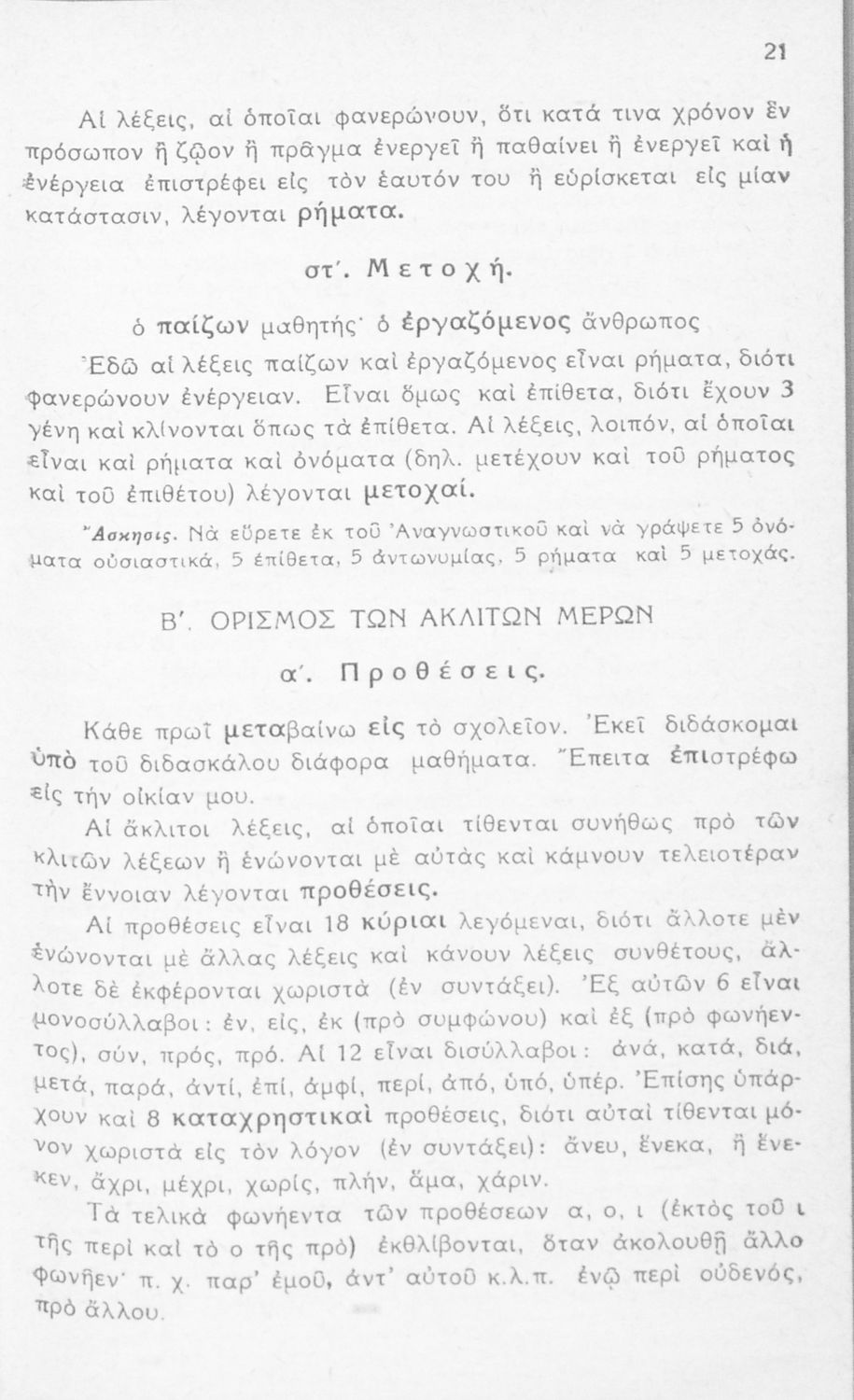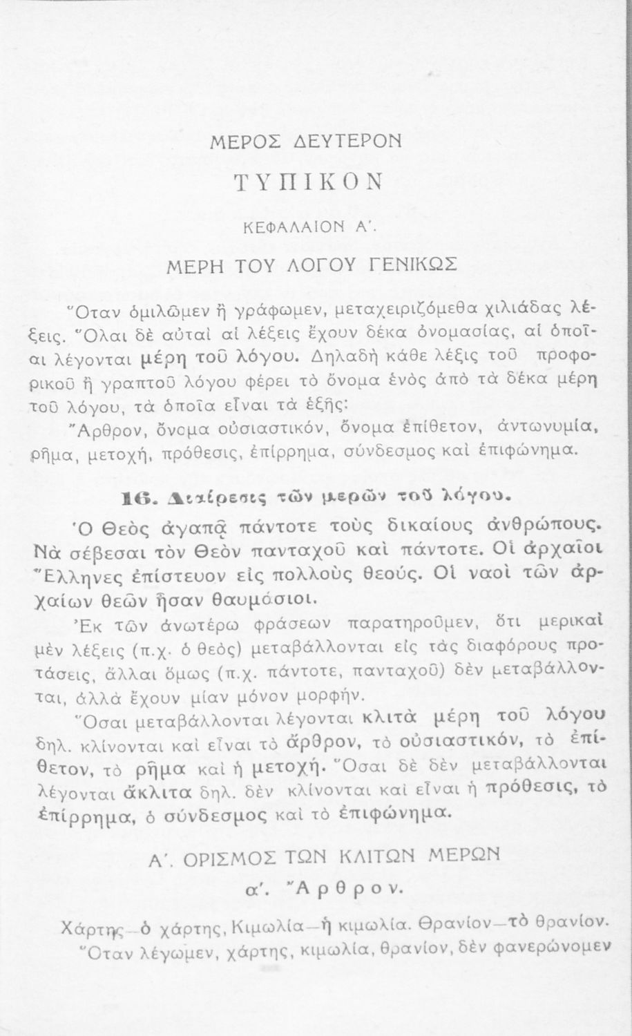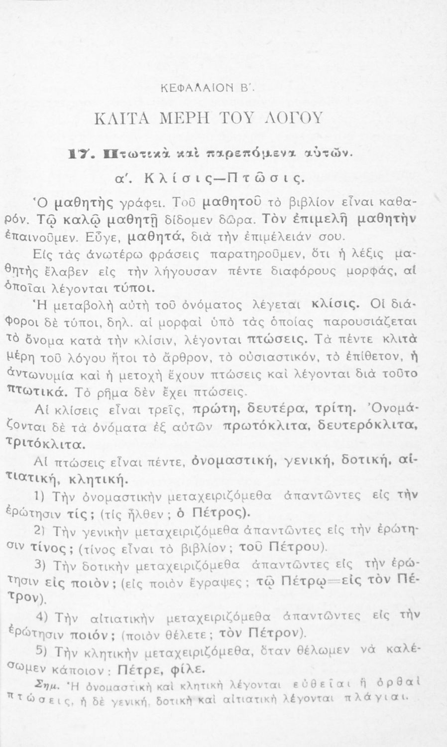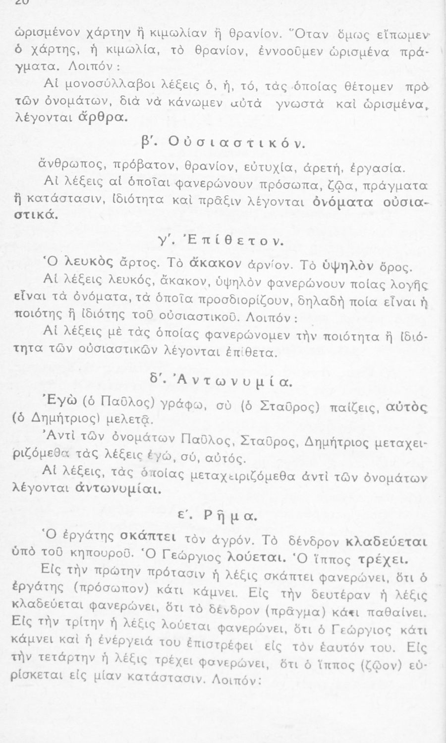 Σχολικό εγχειρίδιο γραμματικής για τους μαθητές της Ε΄ και ΣΤ΄ τάξης του Δημοτικού. Περιέχει τη διδασκαλία της γραμματικής της καθαρεύουσας με κανόνες και παραδείγματα.