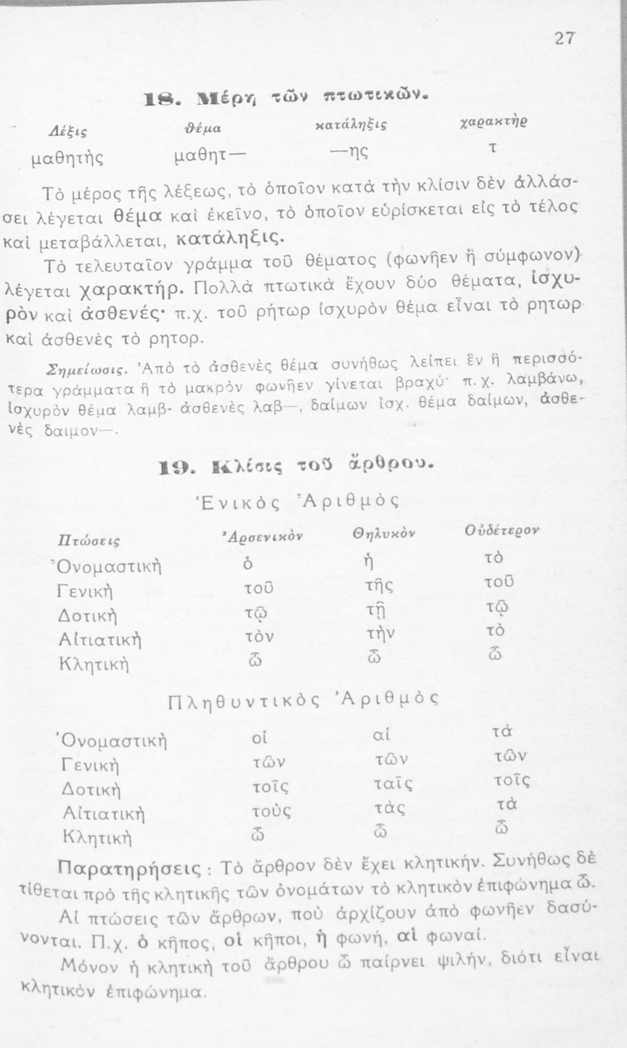 Μαθητικό βοήθημα Γλώσσας Ε΄ και ΣΤ΄ Δημοτικού που περιλαμβάνει τους κανόνες γραμματικής της καθαρεύουσας και είναι χωρισμένη στο φθογγολογικό, το τυπολογικό και ετυμολογικό μέρος. Περιέχει και παράρτημα με το συντακτικό της καθαρεύουσας.