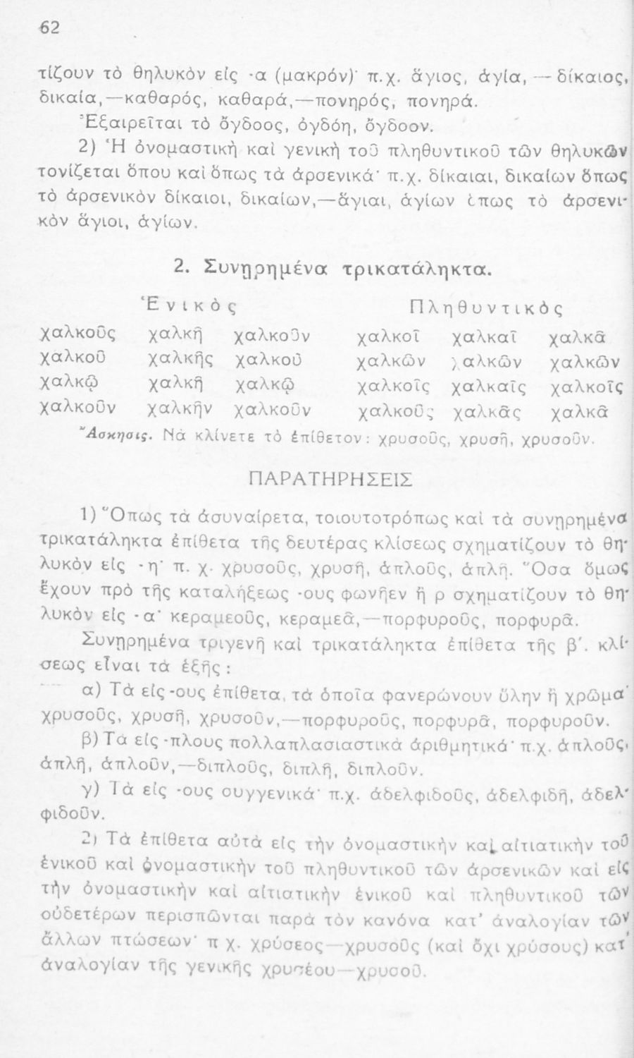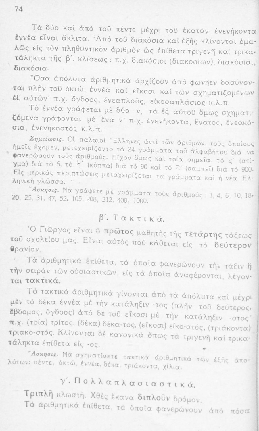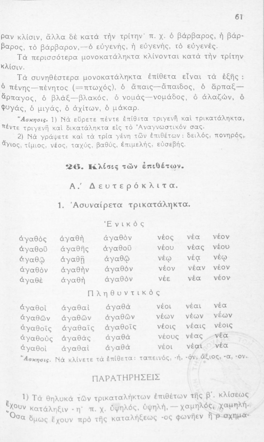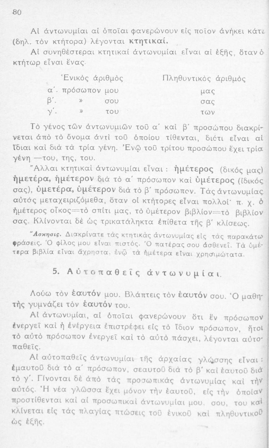 Σχολικό εγχειρίδιο γραμματικής για τους μαθητές της Ε΄ και ΣΤ΄ τάξης του Δημοτικού. Περιέχει τη διδασκαλία της γραμματικής της καθαρεύουσας με κανόνες και παραδείγματα.