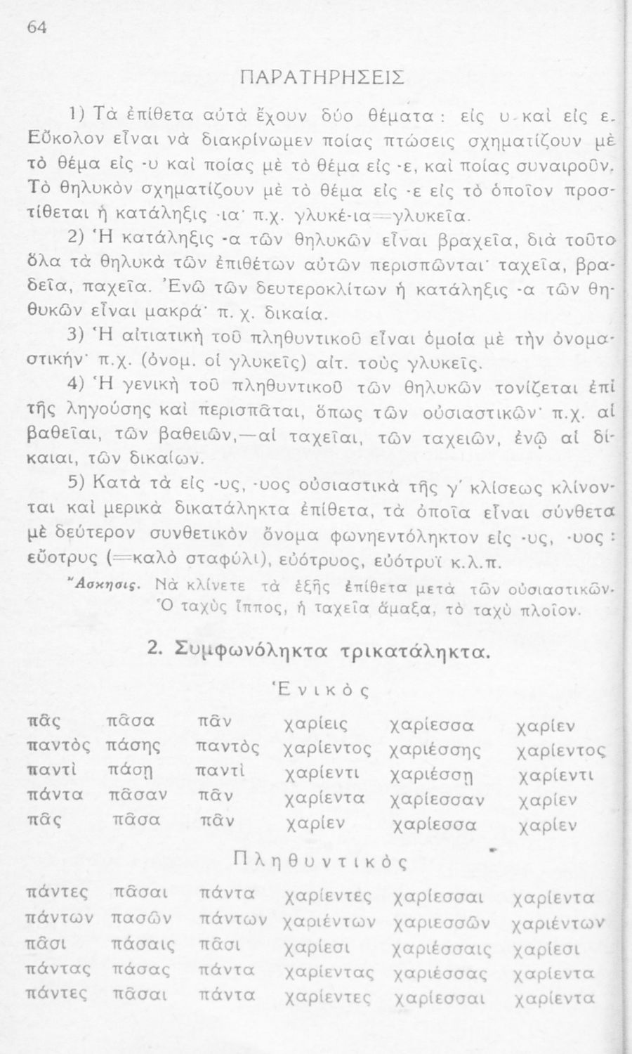 Μαθητικό βοήθημα Γλώσσας Ε΄ και ΣΤ΄ Δημοτικού που περιλαμβάνει τους κανόνες γραμματικής της καθαρεύουσας και είναι χωρισμένη στο φθογγολογικό, το τυπολογικό και ετυμολογικό μέρος. Περιέχει και παράρτημα με το συντακτικό της καθαρεύουσας.