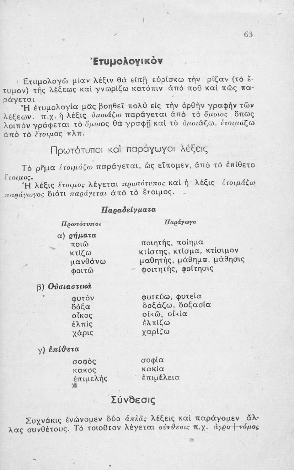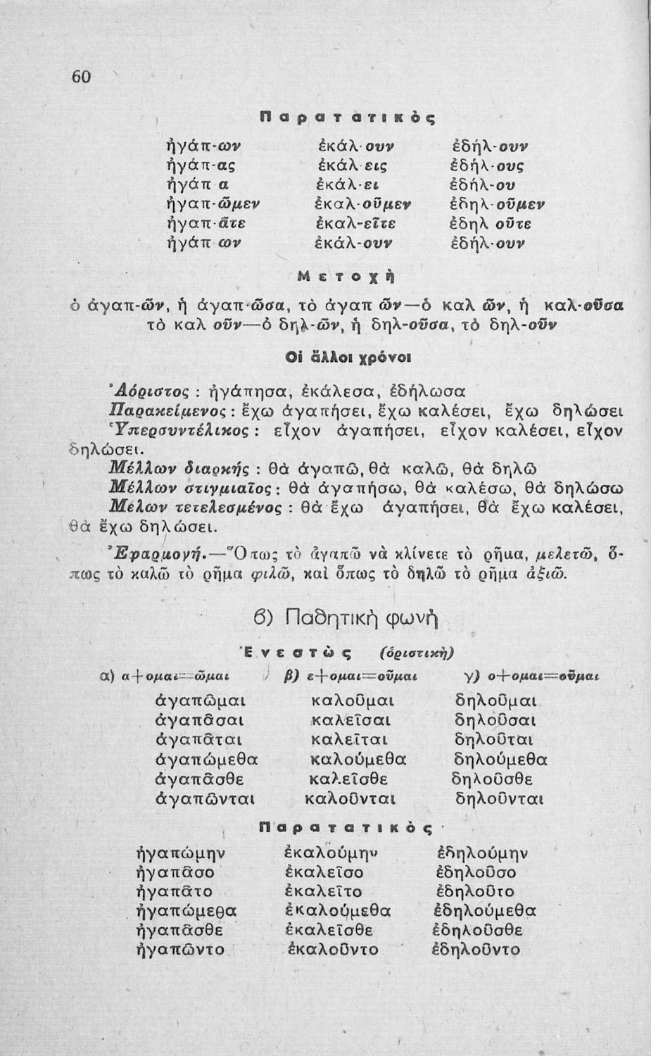 Μαθητικό βοήθημα Γλώσσας Ε΄ και ΣΤ΄ Δημοτικού που περιλαμβάνει τους κανόνες γραμματικής της καθαρεύουσας και είναι χωρισμένη στο φθογγολογικό, το τυπολογικό και ετυμολογικό μέρος. Περιέχει και παράρτημα με το συντακτικό της καθαρεύουσας.