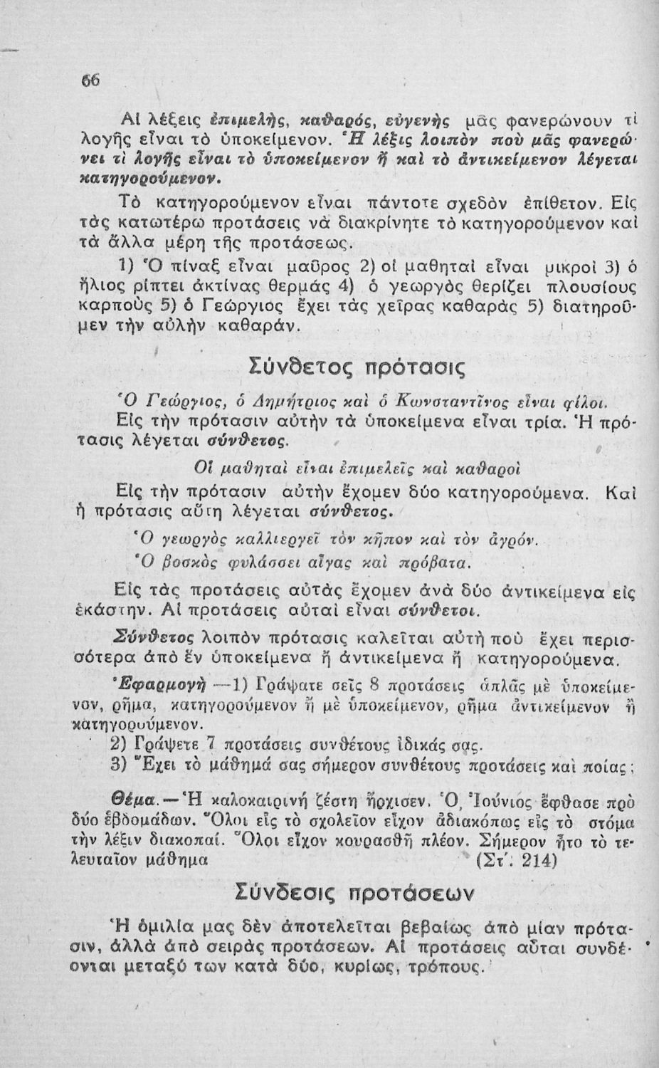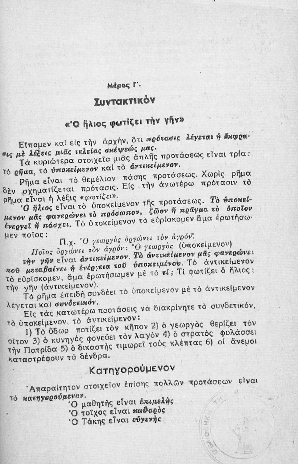 Σχολικό εγχειρίδιο Γραμματικής για τους μαθητές του Δημοτικού. Περιέχει την διδασκαλία της Γραμματικής της Καθαρεύουσας για τα Δημοτικά σχολεία.