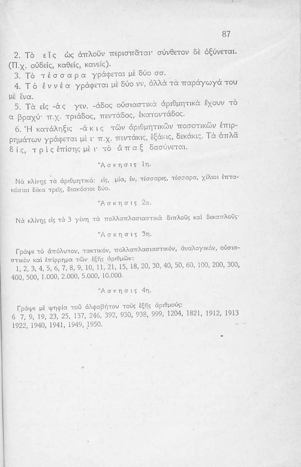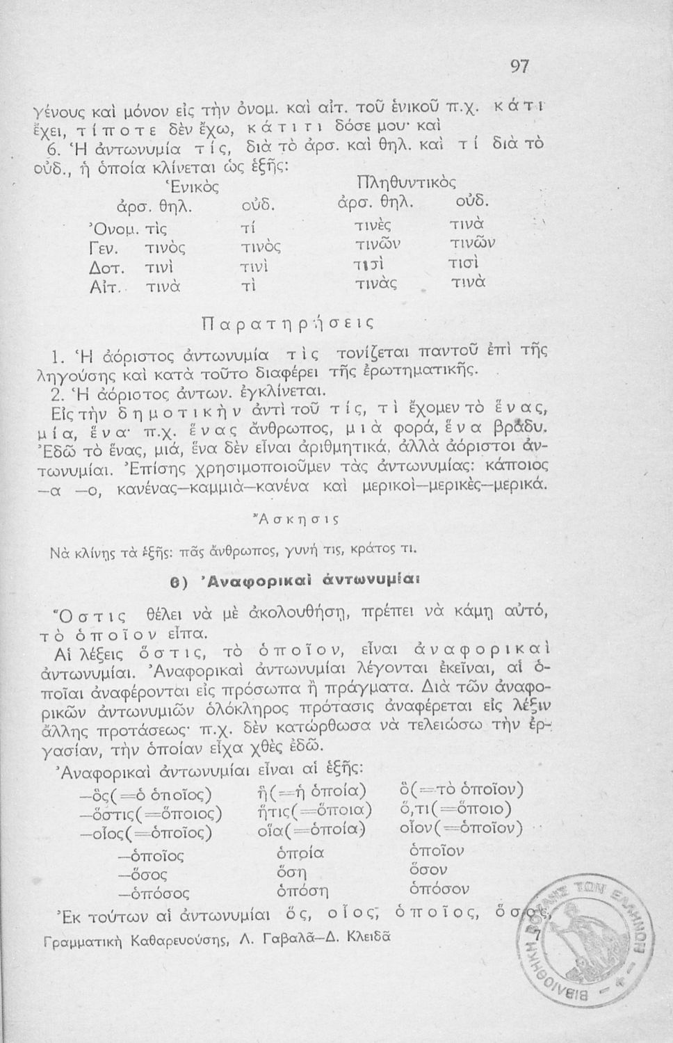 Παρουσίαση περιεχομένου: Μαθητικό βοήθημα Δημοτικού που περιέχει θεωρία και ασκήσεις της γραμματικής για την εκμάθηση της καθαρεύουσας.