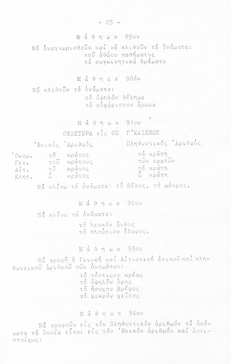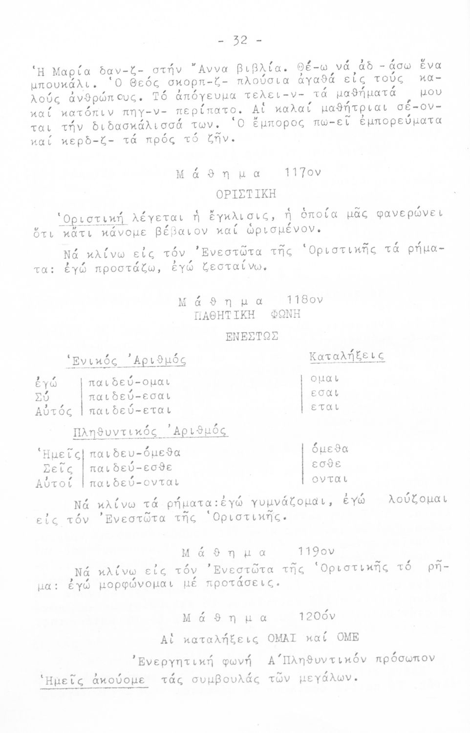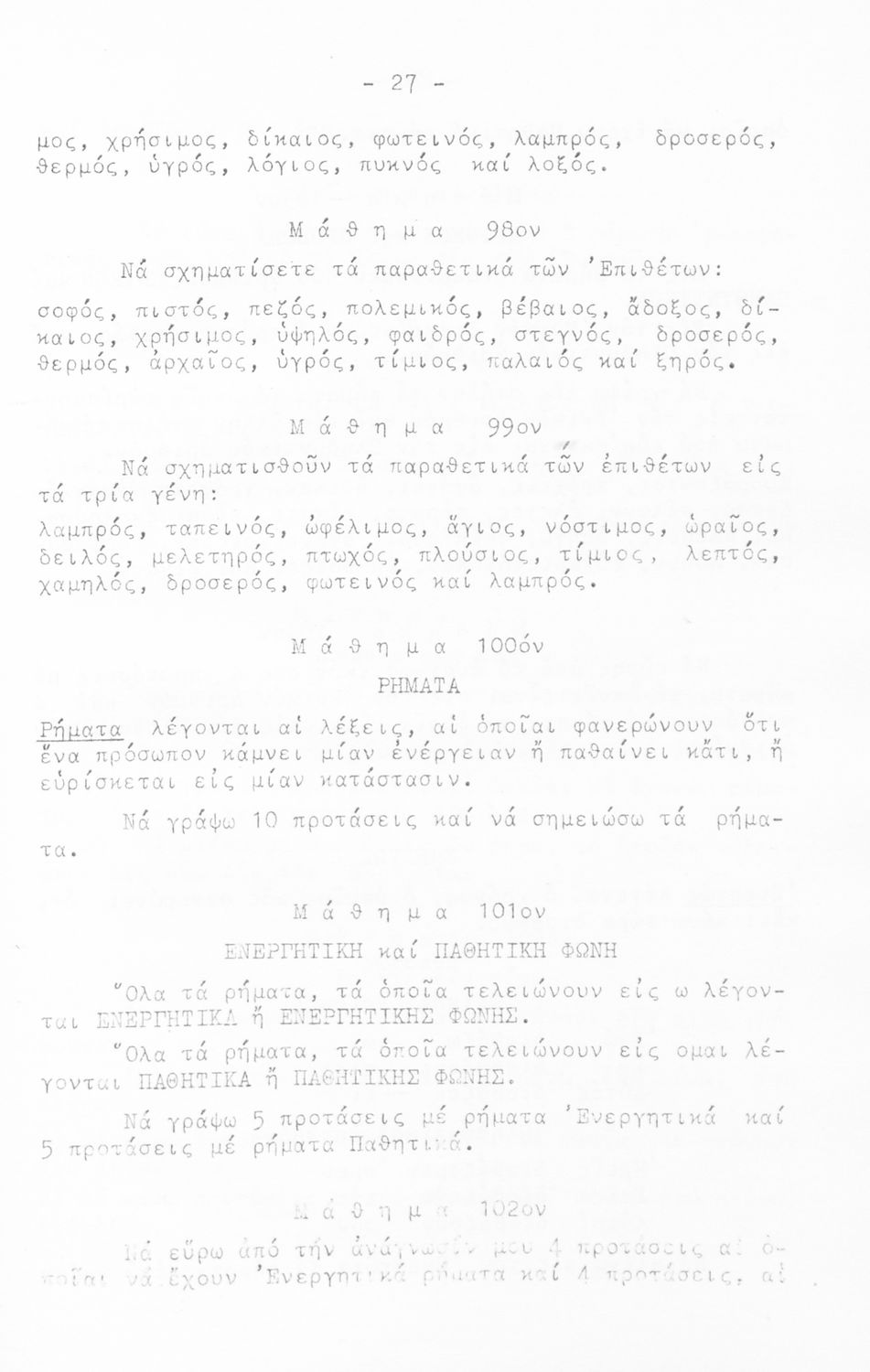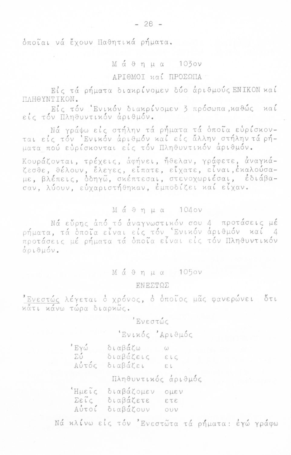 Βαθμίδα εκπαίδευσης: Πρωτοβάθμια Τάξη: Δ' Δημοτικού Μάθημα: Νέα Ελληνικά Γλώσσα: Απλή καθαρεύουσα Παρουσίαση περιεχομένου: Μαθητικό βοήθημα Γλώσσας Δ' Δημοτικού που περιλαμβάνει ασκήσεις γραμματικής. |