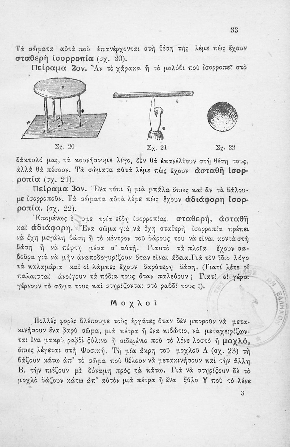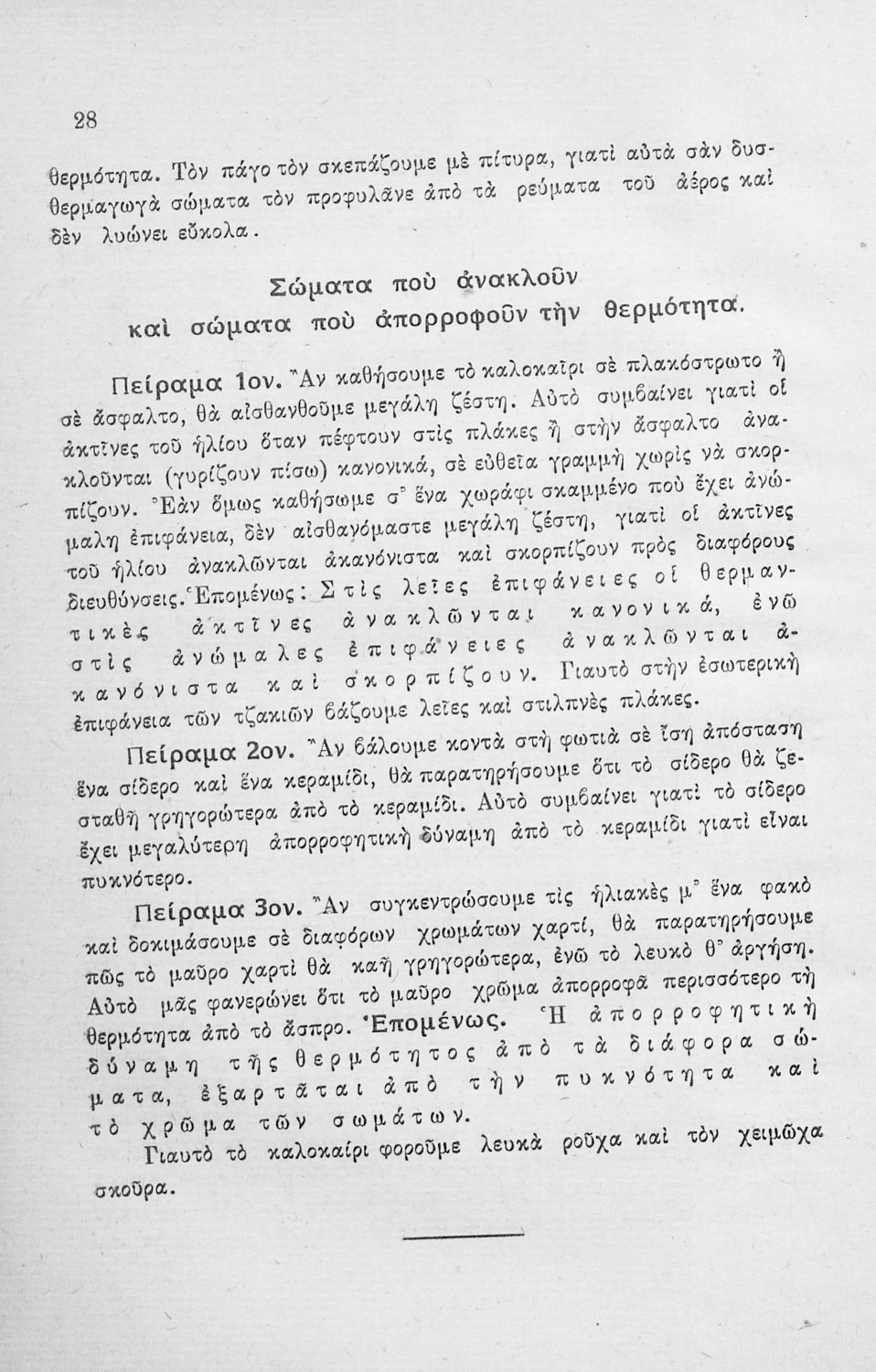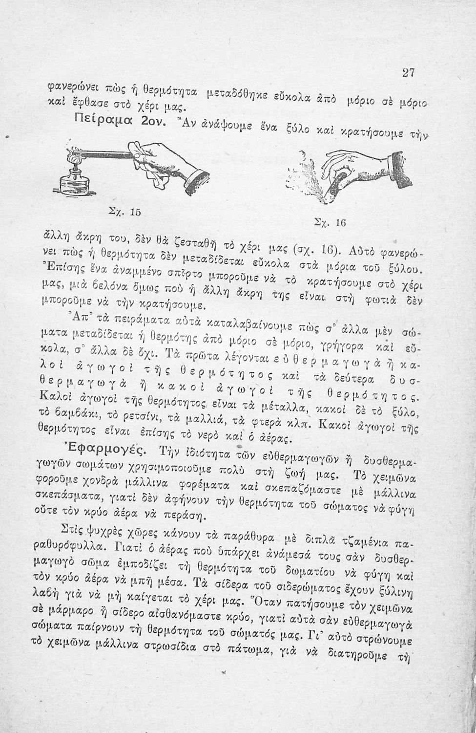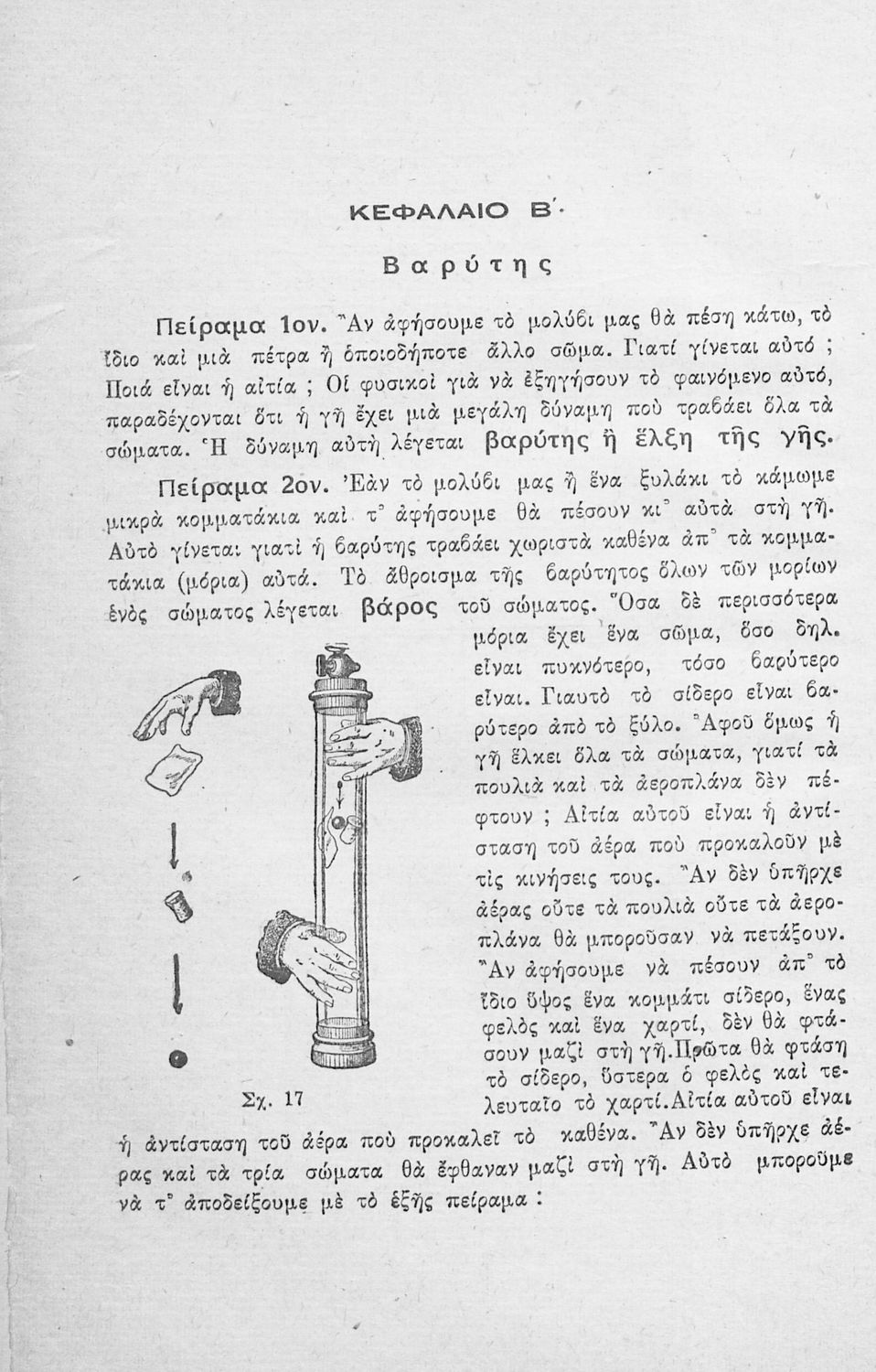Σχολικό εγχειρίδιο για την Ε΄ Δημοτικού για το μάθημα της Φυσικής και Χημείας. Το εγχειρίδιο περιλαμβάνει τις βασικές έννοιες της πειραματικής φυσικής (θερμότητα, απόσταξη, εξάτμιση, βαρύτητα, υδροστατική, κ.α.). Το δεύτερο μέρος ασχολείται με την χρησιμότητα του οξυγόνου, του υδρογόνου, του άνθρακα, του τσιμέντου και των χρωστικών ουσιών στην καθημερινότητα των ανθρώπων.