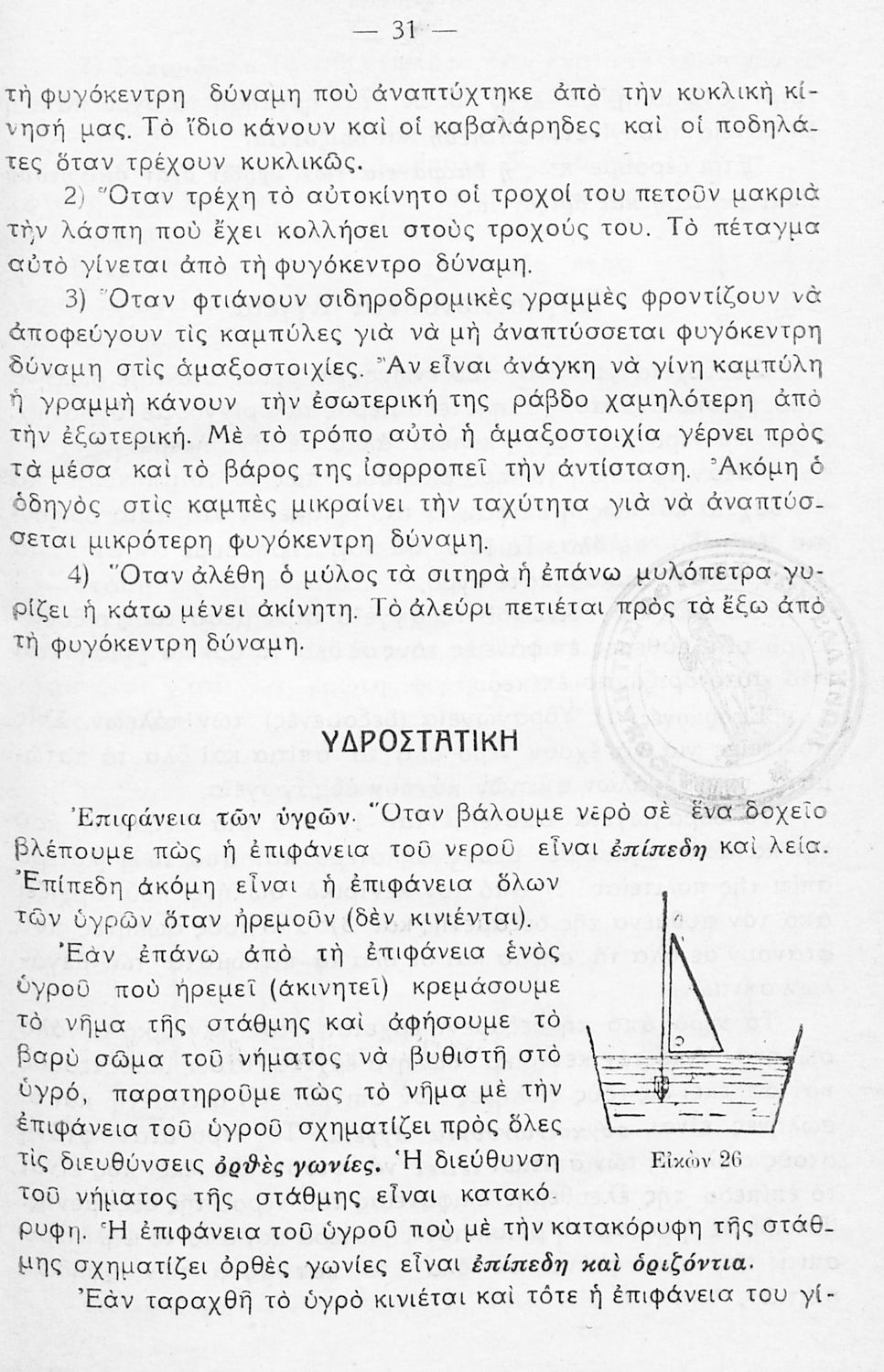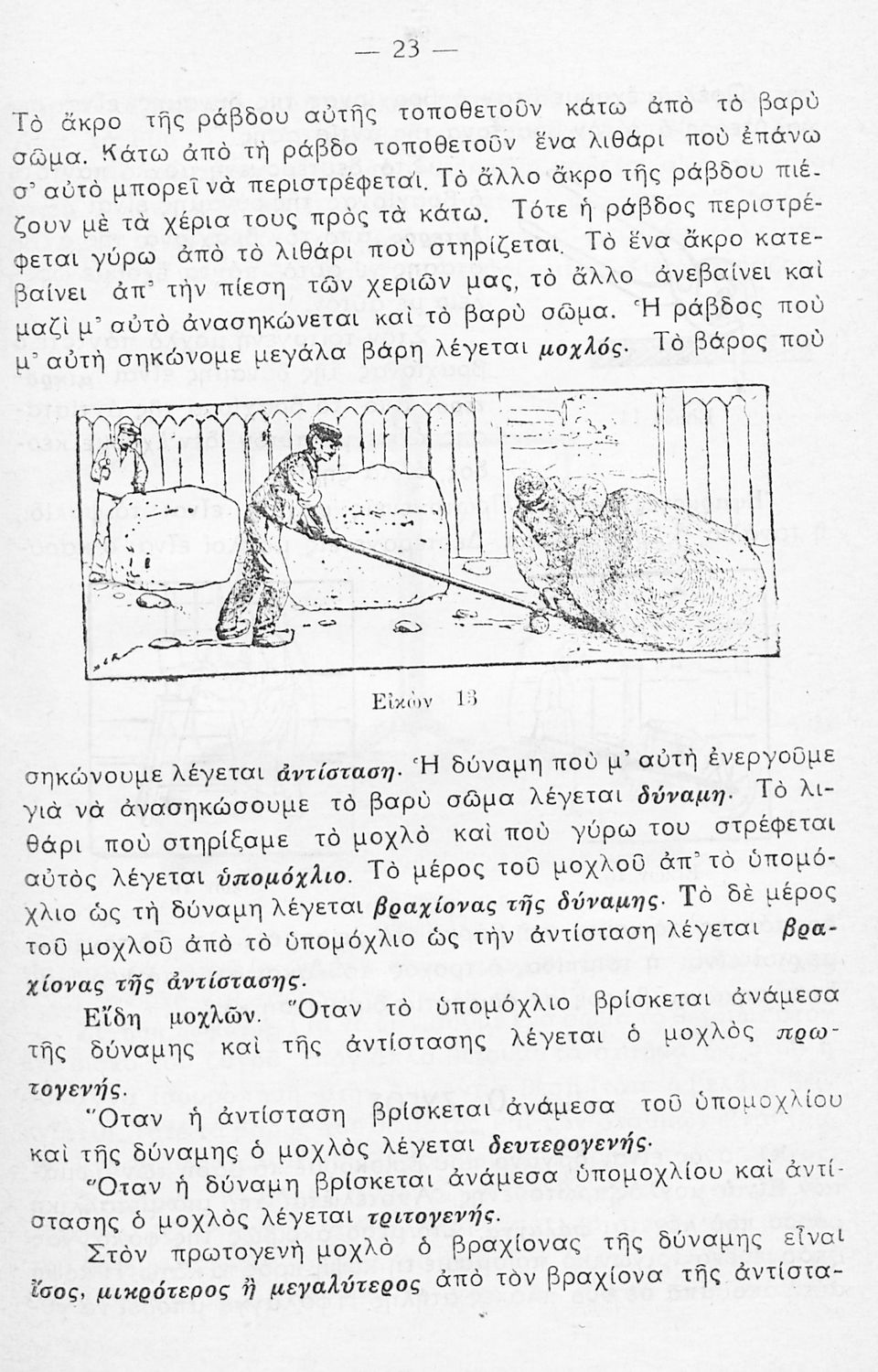 Βαθμίδα εκπαίδευσης: Πρωτοβάθμια Τάξη: Ε' Δημοτικού / ΣΤ' Δημοτικού Γλώσσα: Δημοτική Παρουσίαση περιεχομένου: Σχολικό εγχειρίδιο για την Ε΄ και ΣΤ΄ Δημοτικού για το μαθήματα της Φυσικής και της Χημείας. Το εγχειρίδιο περιλαμβάνει τις βασικές έννοιες της φυσικής, όπως του βρασμού, της εξαέρωσης, της φυγόκεντρου δύναμης, της πυκνότητας των σωμάτων, της αεροστατικής, της ατμόσφαιρας και της ατμοσφαιρικής πίεσης. Η θεματική της χημείας περιλαμβάνει τις έννοιες του οξυγόνου και του υδρογόνου, την οξείδωση των μετάλλων, τις φυσικές χρωστικές ουσίες και την καθημερινήν χρήση αντικειμένων. |