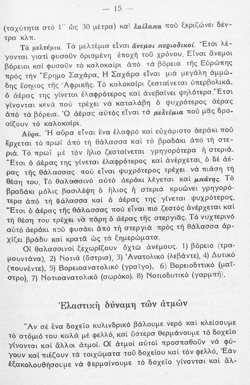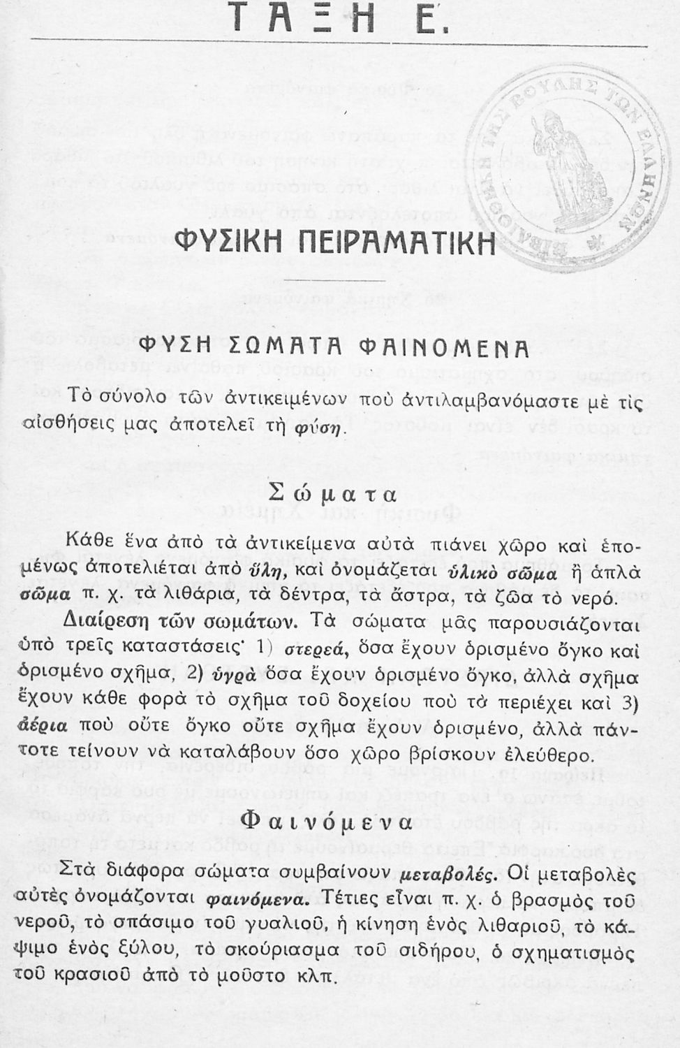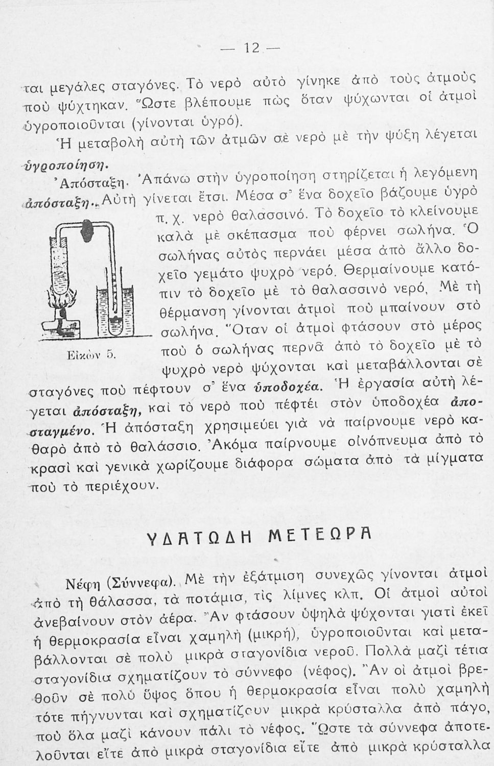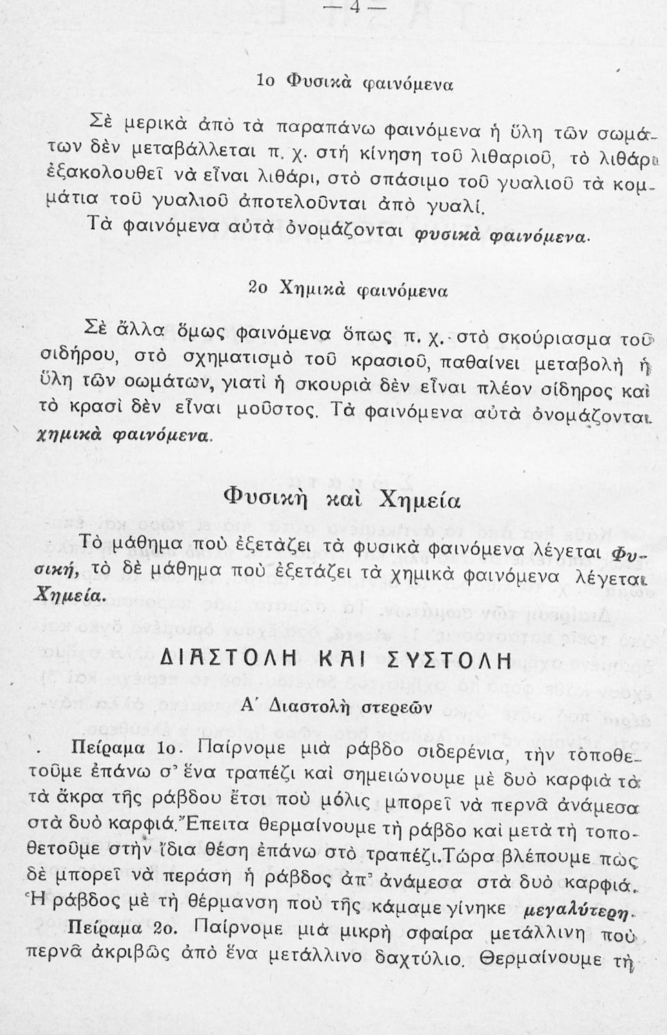 Σχολικό εγχειρίδιο για την Ε΄ και ΣΤ΄ Δημοτικού για το μαθήματα της Φυσικής και της Χημείας. Το εγχειρίδιο περιλαμβάνει τις βασικές έννοιες της φυσικής, όπως του βρασμού, της εξαέρωσης, της φυγόκεντρου δύναμης, της πυκνότητας των σωμάτων, της αεροστατικής, της ατμόσφαιρας και της ατμοσφαιρικής πίεσης. Η θεματική της χημείας περιλαμβάνει τις έννοιες του οξυγόνου και του υδρογόνου, την οξείδωση των μετάλλων, τις φυσικές χρωστικές ουσίες και την καθημερινήν χρήση αντικειμένων.
