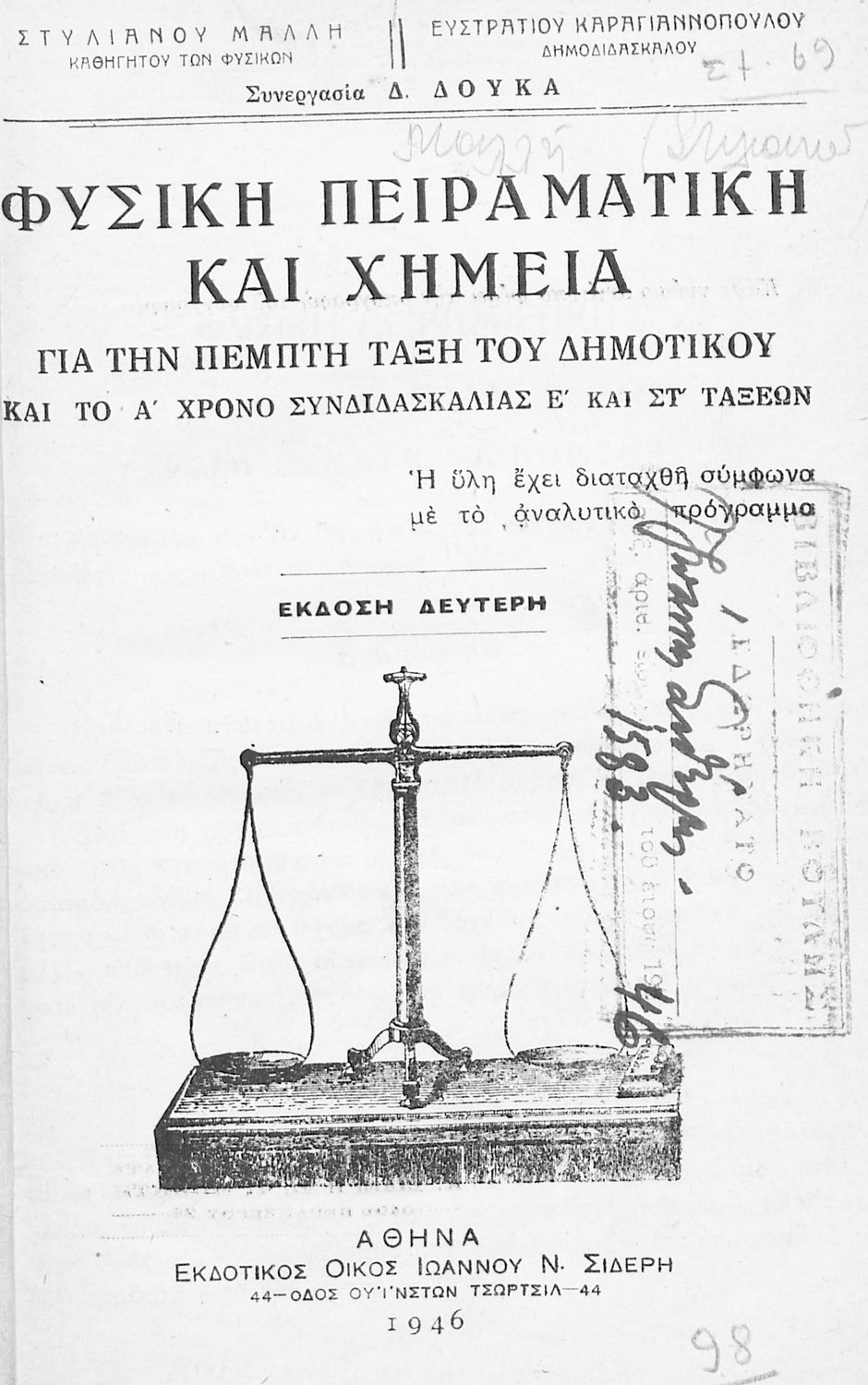 Κωδικός αναγνώρισης: 03-20560909 Τίτλος: Φυσική πειραματική και χημεία για την Πέμπτη τάξη του Δημοτικού και το Α΄ χρόνο συνδιδασκαλίας Ε΄ και ΣΤ΄ τάξεων Συγγραφέας: Στυλιανός Μάλλης, Ευστράτιος Καραγιαννόπουλος Μέγεθος και υπόστρωμα: Σχολικό εγχειρίδιο, σκληρό εξώφυλλο, 78 σελίδες. Σκίτσα (ασπρόμαυρα). |