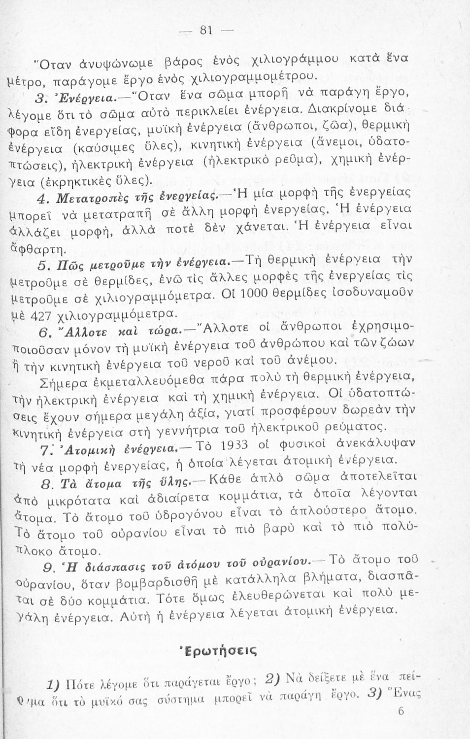 Σχολικό εγχειρίδιο Φυσικής και Χημείας για τους μαθητές της ΣΤ ΄ Δημοτικού. Το βιβλίο παρουσιάζει βασικές έννοιες της Φυσικής όπως η ύλη και η ενέργεια, θερμότητα και μηχανική των σωμάτων. Τέλος, παρουσιάζει συνοπτικά τα χαρακτηριστικά και ιδιότητες βασικών χημικών στοιχείων καθώς και τη συνεισφορά των δύο αυτών επιστημών στη ζωή των ανθρώπων.