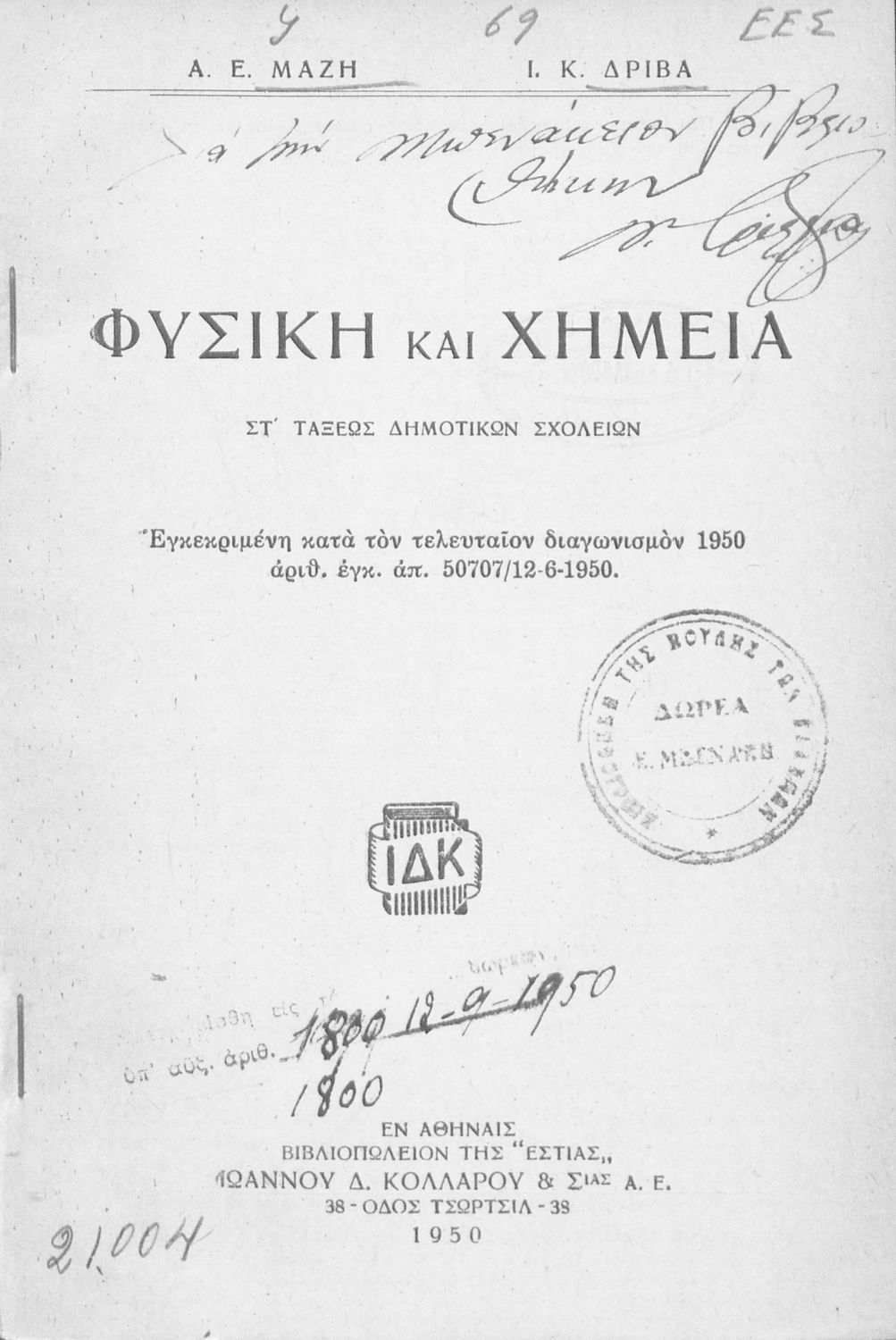 Κωδικός αναγνώρισης: 03-20560934 Τίτλος: Φυσική και Χημεία ΣΤ΄ τάξεως Δημοτικών Σχολείων Συγγραφέας: Αλκίνοος Μάζης, Ιωάννης Δρίβας Μέγεθος και υπόστρωμα: Σχολικό εγχειρίδιο, μαλακό εξώφυλλο, 116 σελίδες. Εικόνες (ασπρόμαυρες), σκίτσα (ασπρόμαυρα). |