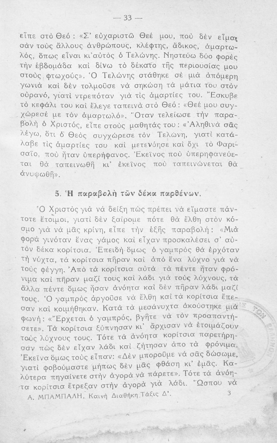 Βαθμίδα εκπαίδευσης: Πρωτοβάθμια Τάξη: Δ' Δημοτικού Μάθημα: Θρησκευτικά Γλώσσα: Απλή καθαρεύουσα Παρουσίαση περιεχομένου: Μαθητικό βοήθημα Θρησκευτικών Δ΄ Δημοτικού που συνιστά μία εξιστόρηση της Καινής Διαθήκης από τη γέννηση της Θεοτόκου ως την ανάληψη του Χριστού. |
