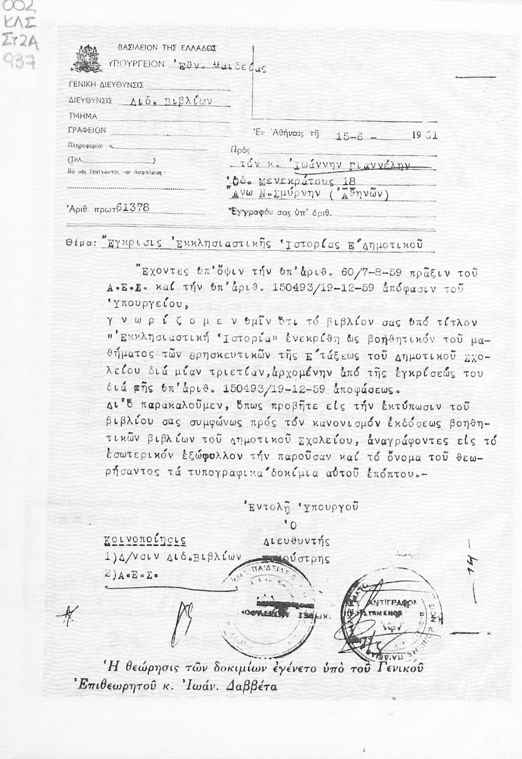 Εκδότης: Κόσμος Έτος έκδοσης: 1961 Τόπος έκδοσης: Αθήνα Υπουργική απόφαση / Σύμβαση: 150493/19-12-1959 Έτος έγκρισης: 1959 |