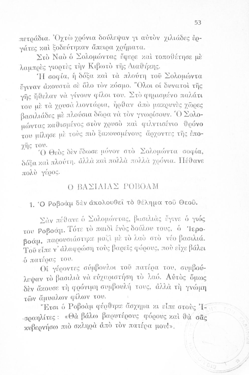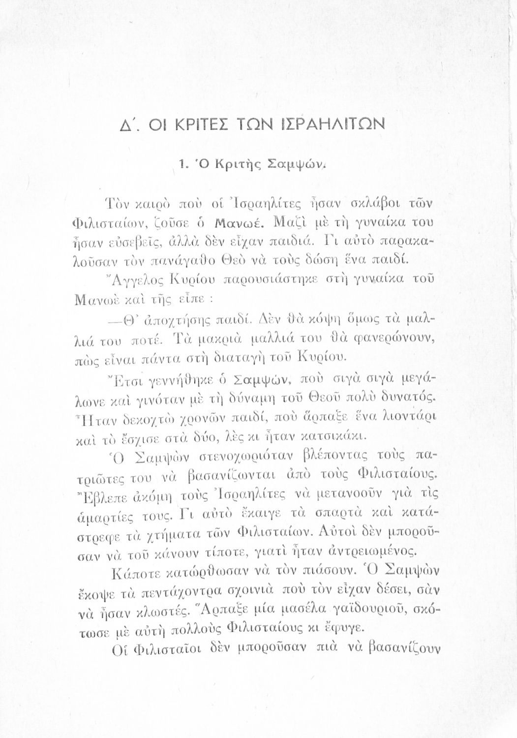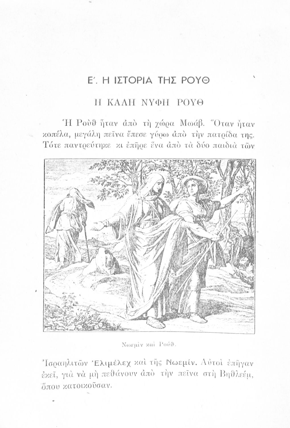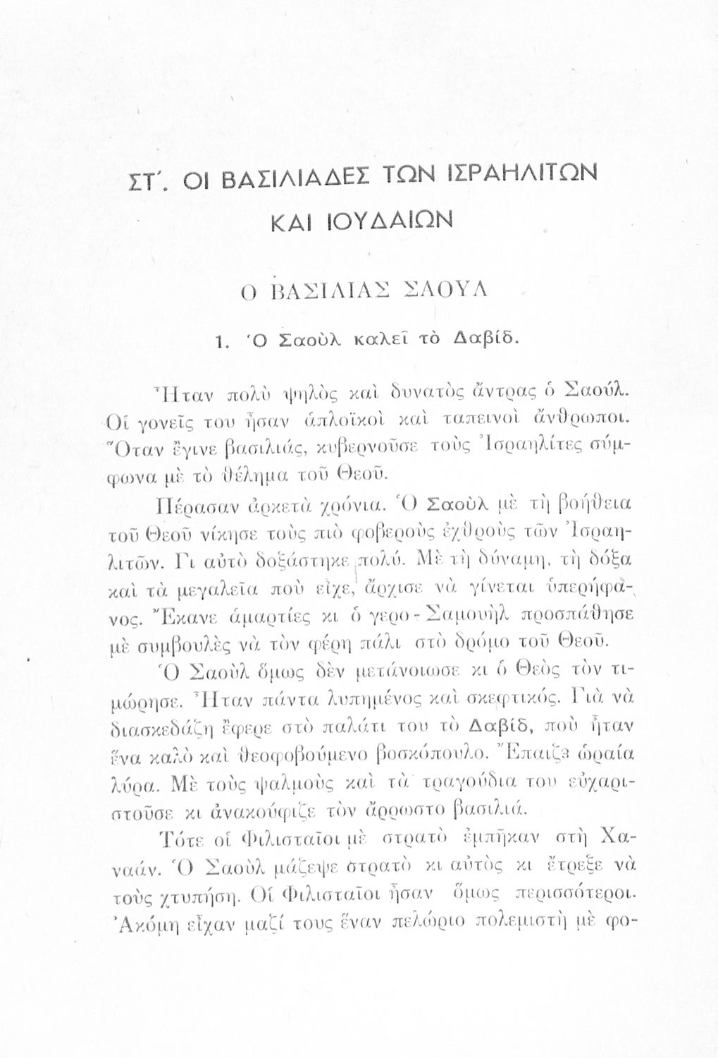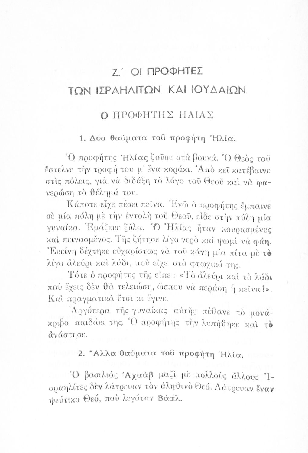 Σχολικό εγχειρίδιο για την Γ΄ Τάξη πιθανόν της Εκκλησιαστικής Γεωργικής Σχολής. Αναφέρεται στα γεγονότα της Παλαιάς Διαθήκης. Περιέχει τη δράση του Ιακώβ, του Μωυσή, μέχρι και τους προφήτες.