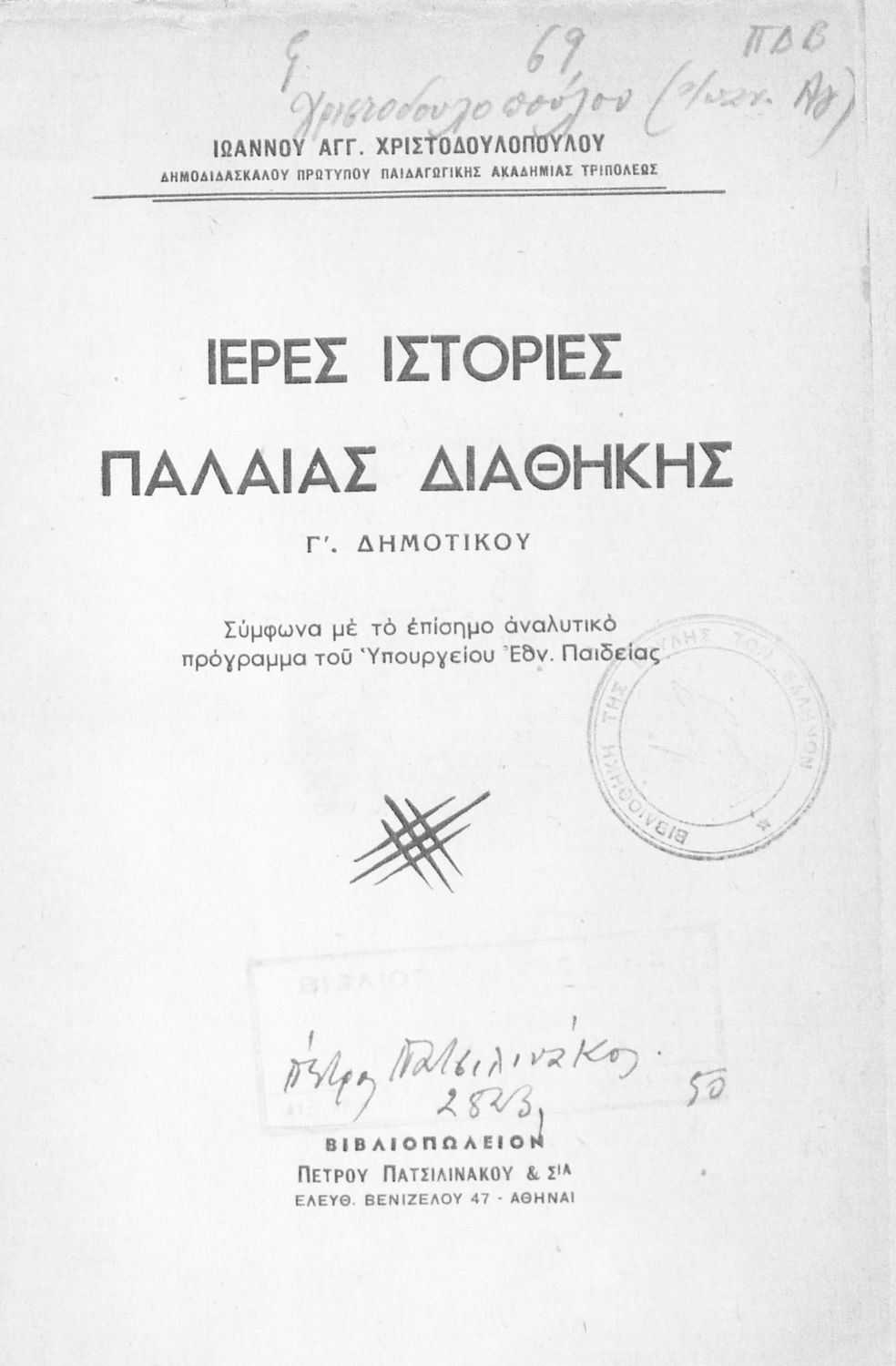 Σχολικό εγχειρίδιο Θρησκευτικών Γ΄ Δημοτικού που συνιστά μία εξιστόρηση της Παλαιάς Διαθήκης από τη δημιουργία του κόσμου ως τους Προφήτες.