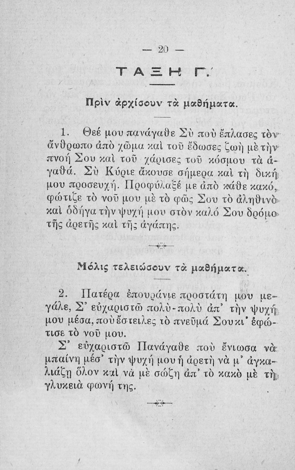 Το σύγγραμμα ήταν σχολικό εγχειρίδιο για το μαθήματα των Θρησκευτικών στο Δημοτικό. Το Α΄ μέρος περιέχει ποιήματα με θρησκευτικό περιεχόμενο, μετά εκκλησιαστικές προσευχές, τα βασικά τροπάρια των οχτώ ήχων, ...