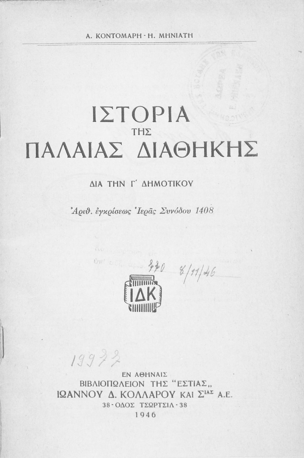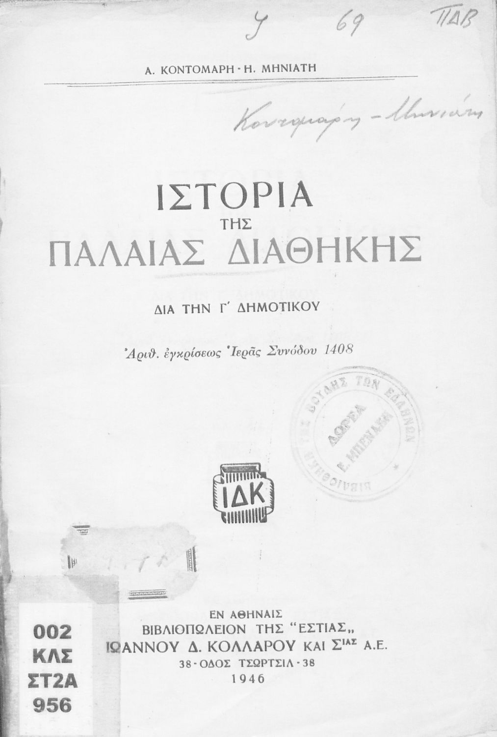Κωδικός αναγνώρισης: 03-20560998 Τίτλος: Ιστορία της Παλαιάς Διαθήκης δια την Γ΄ Δημοτικού Συγγραφέας: Α. Κοντομάρης, Η. Μηνιάτης Μέγεθος και υπόστρωμα: Σχολικό εγχειρίδιο, μαλακό εξώφυλλο, 78 σελίδες. Εικόνες, σκίτσα (ασπρόμαυρα). |