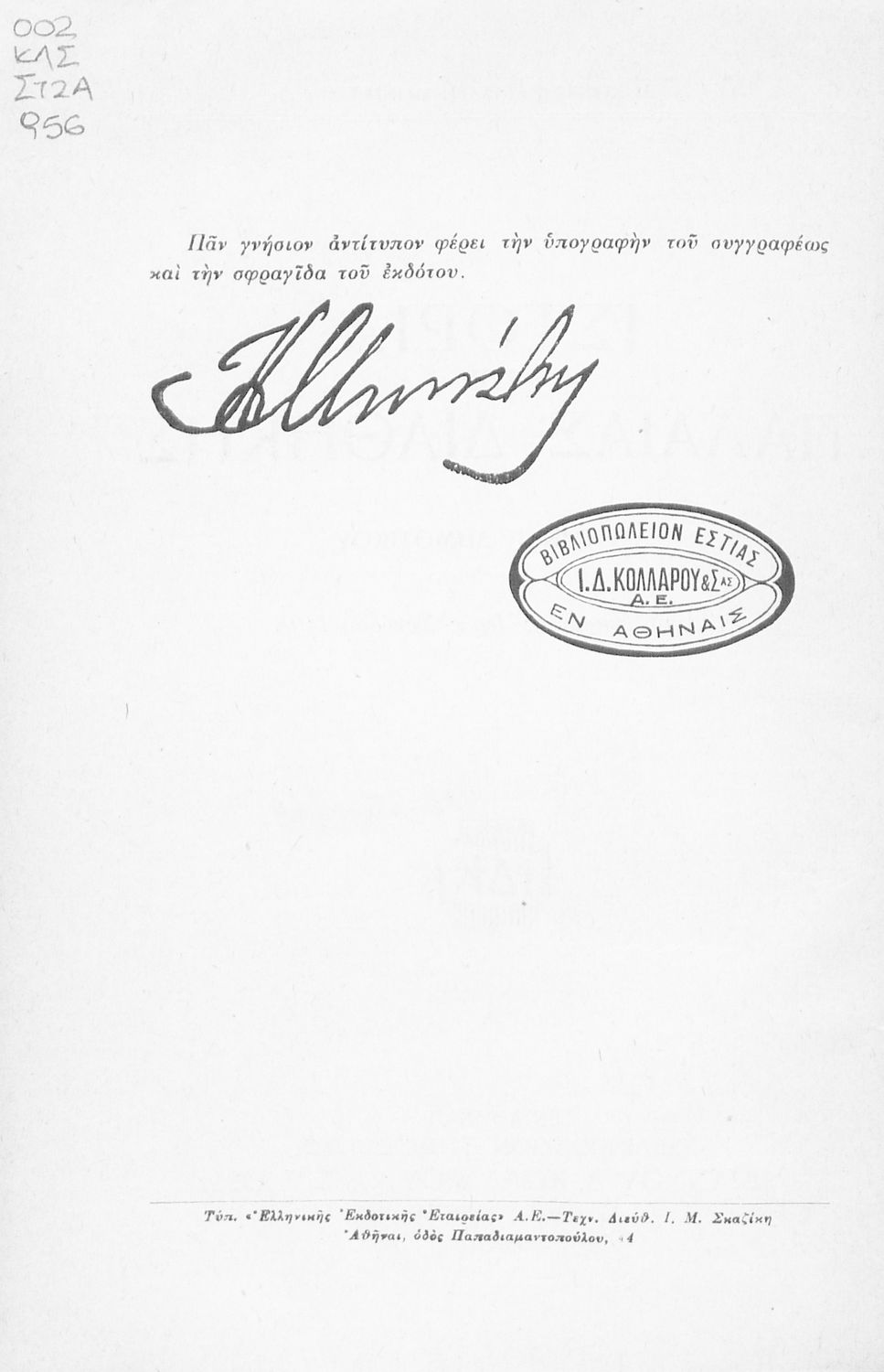 Εκδότης: Ιωάννης Δ. Κολλάρος και ΣΙΑ, Βιβλιοπωλείο της "Εστίας" Έτος έκδοσης: 1946 Τόπος έκδοσης: Αθήνα |