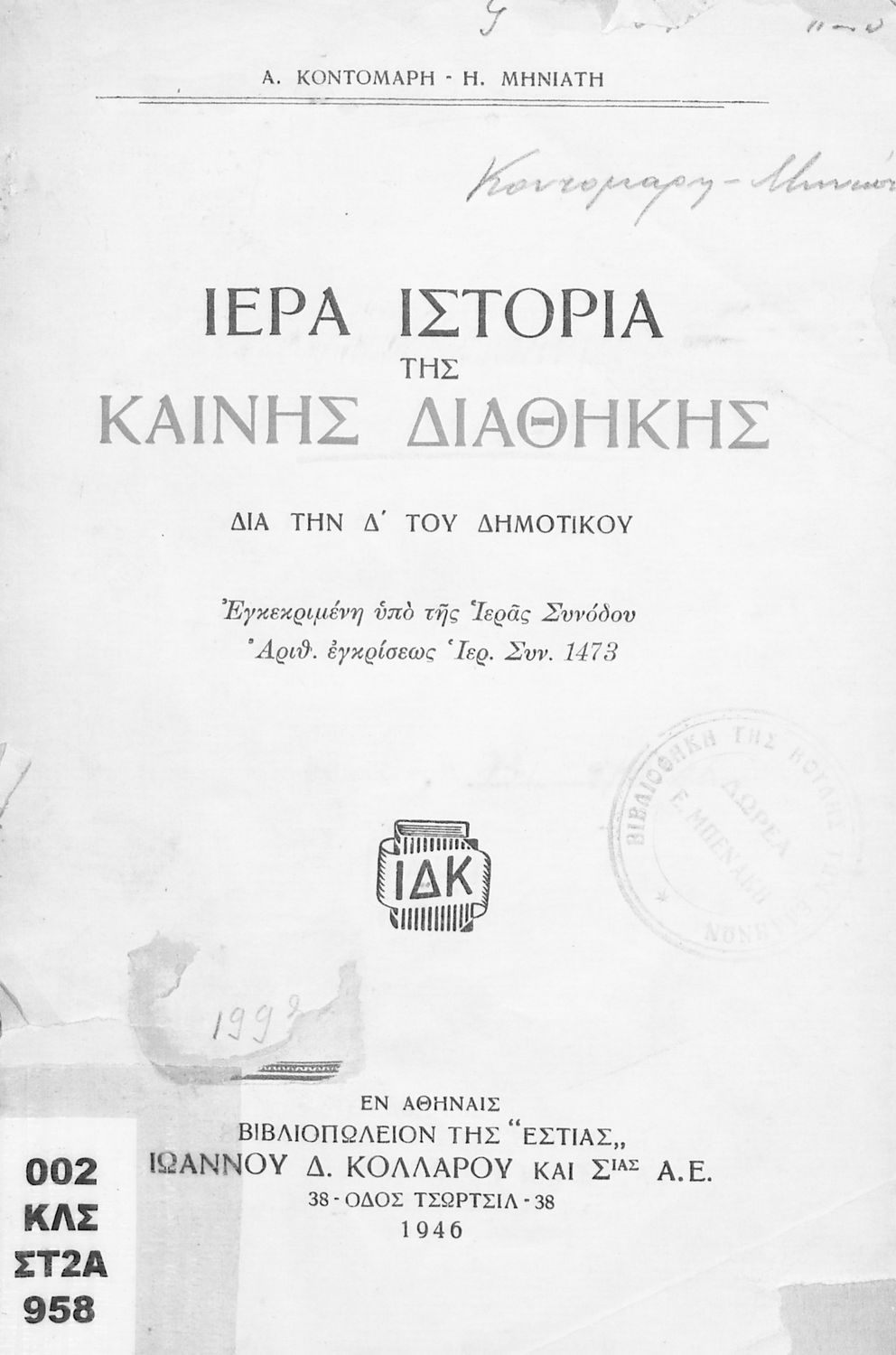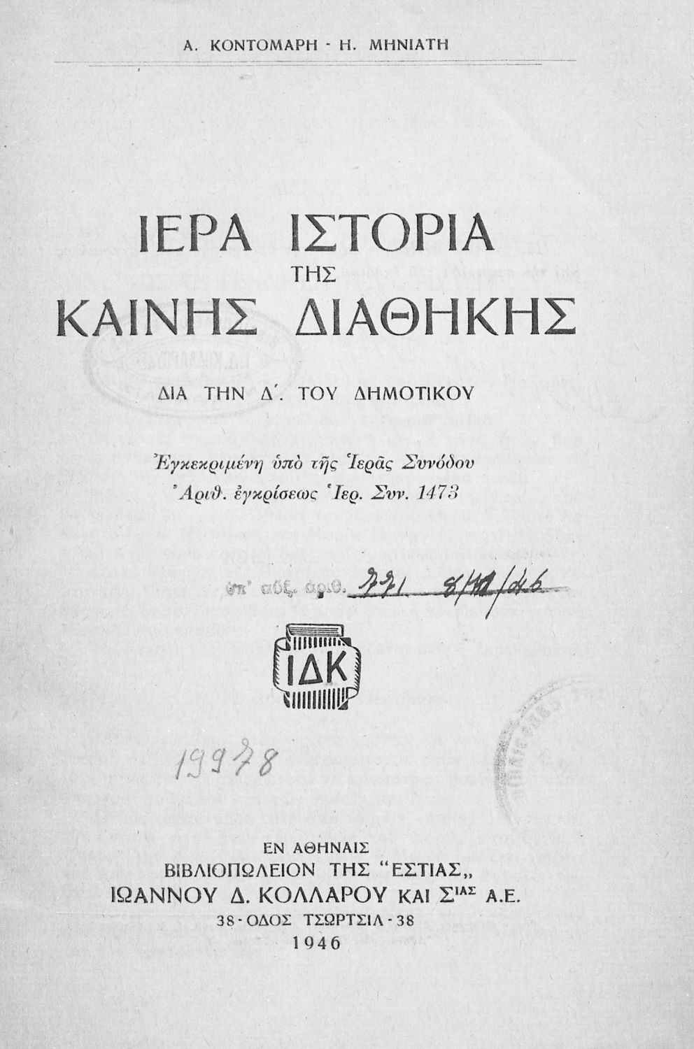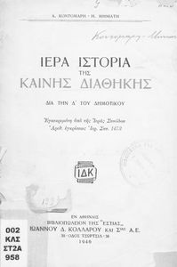 Κωδικός αναγνώρισης: 03-20561000 Τίτλος: Ιερά Ιστορία της Καινής Διαθήκης. Δια την Δ΄ του Δημοτικού Συγγραφέας: Α. Κοντομάρης, Η. Μηνιάτης Μέγεθος και υπόστρωμα: Σχολικό εγχειρίδιο, μαλακό εξώφυλλο, 68 σελίδες. Σκίτσα, εικόνες (ασπρόμαυρα). |