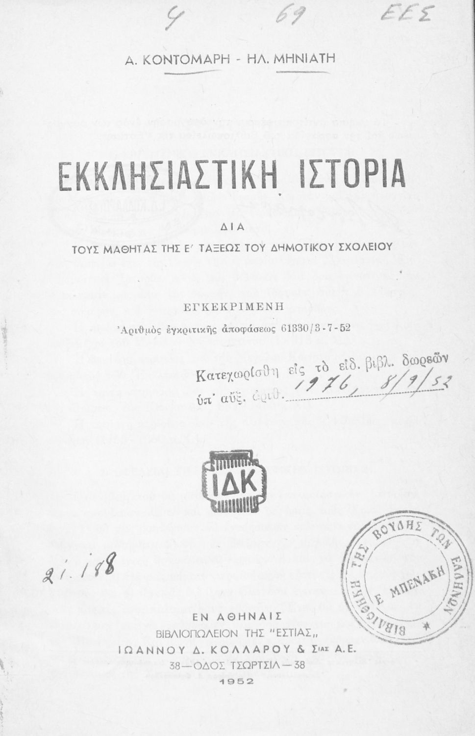 Συγγραφέας: Α. Κοντομάρης, Ηλ. Μηνιάτης