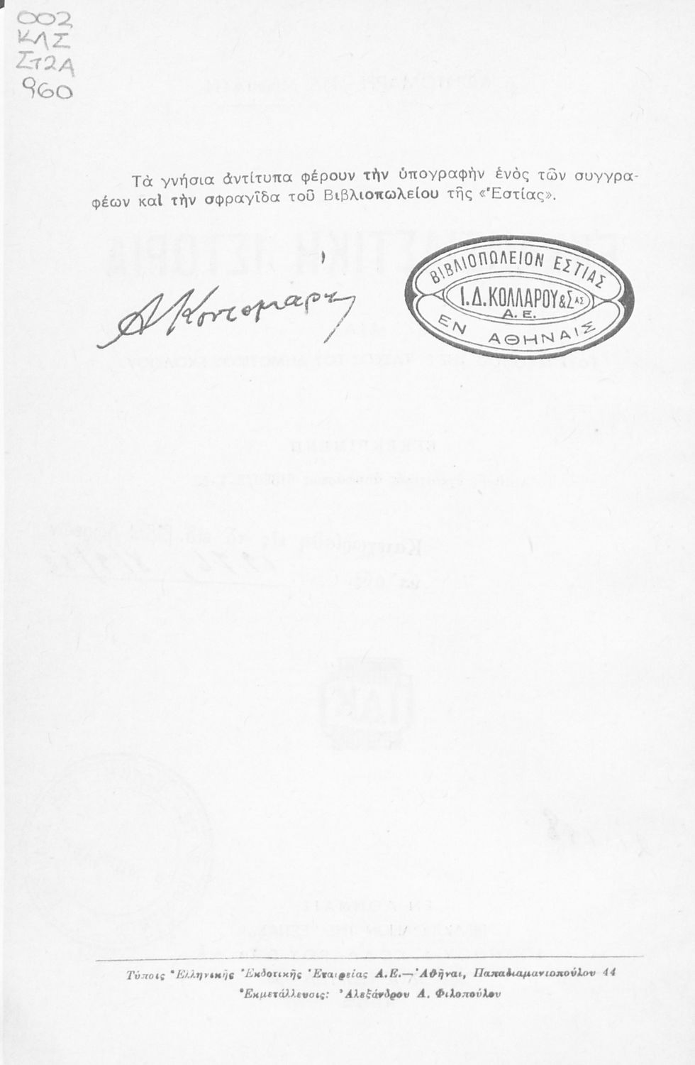 Εκδότης: Ιωάννης Δ. Κολλάρος, Βιβλιοπωλείο της "Εστίας"