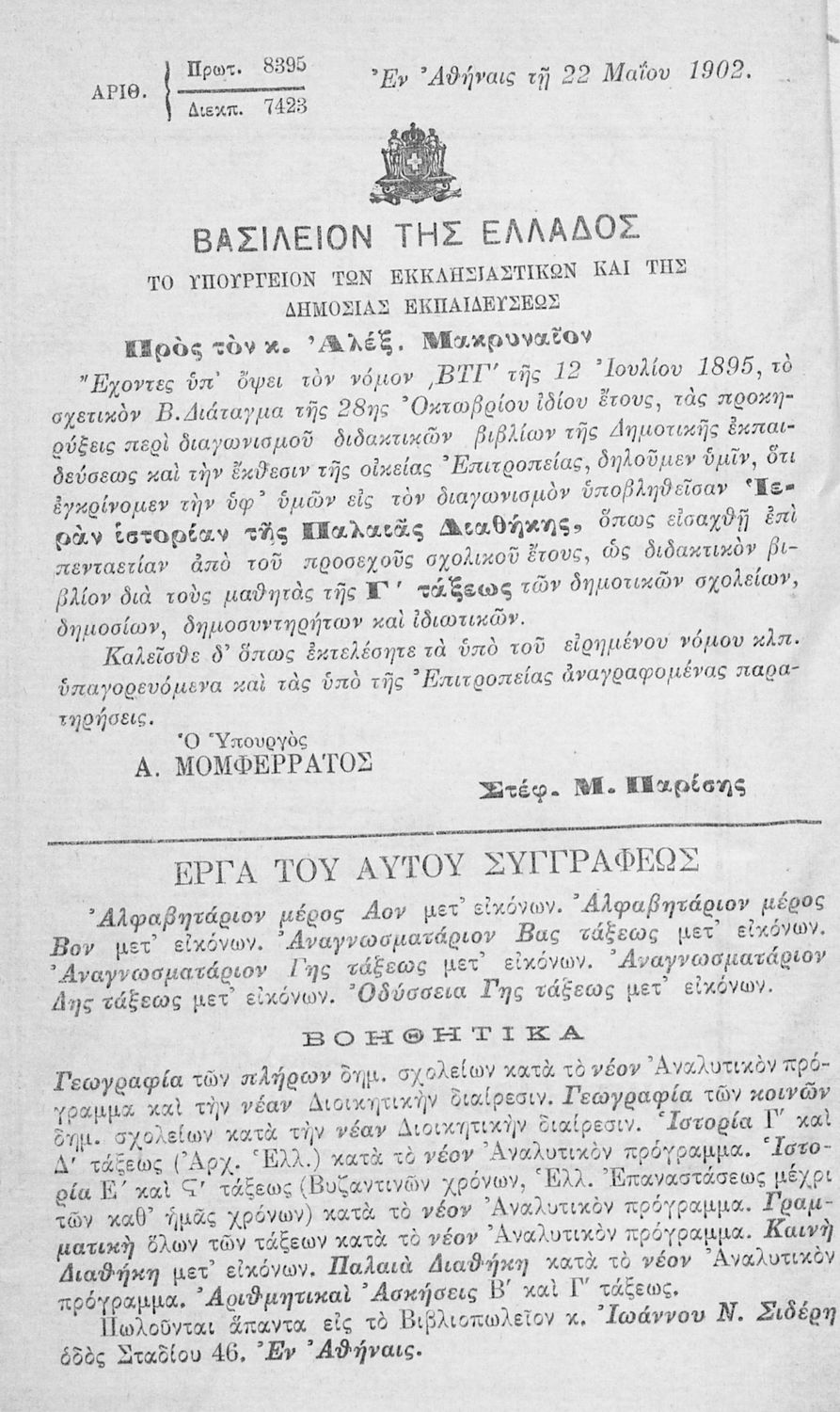Εκδότης: Ιωάννης Ν. Σιδέρης Έτος έκδοσης: 1916 Τόπος έκδοσης: Αθήνα Έκδοση: 4η Υπουργική απόφαση / Σύμβαση: 8395/22-5-1902 Έτος έγκρισης: 1902 |