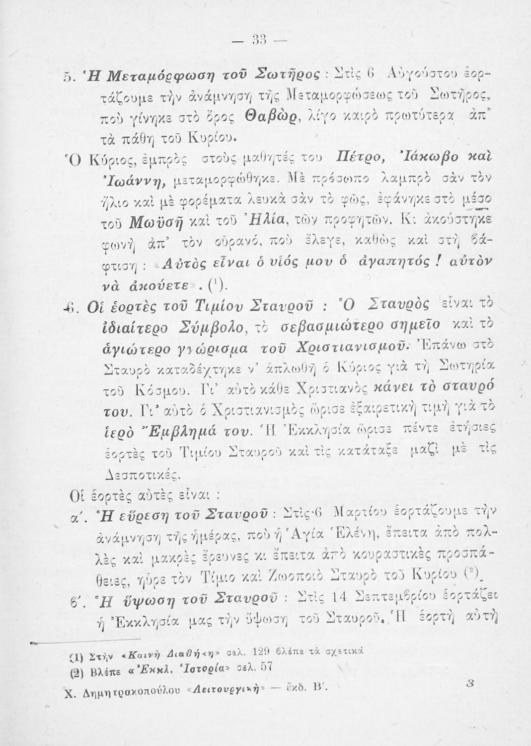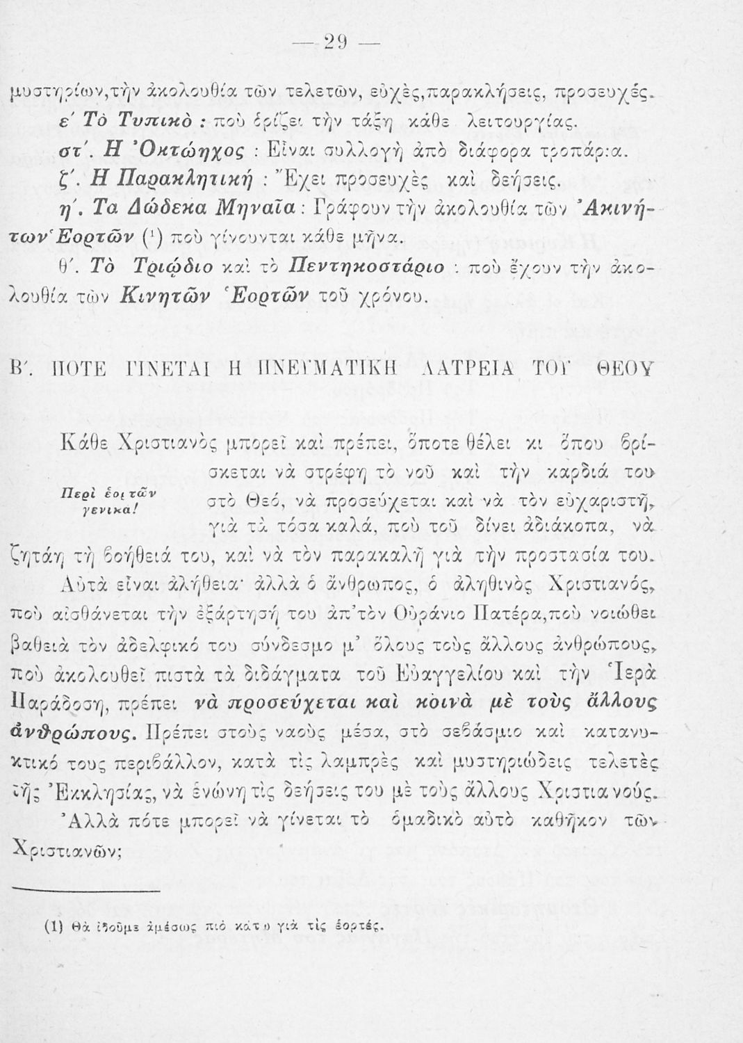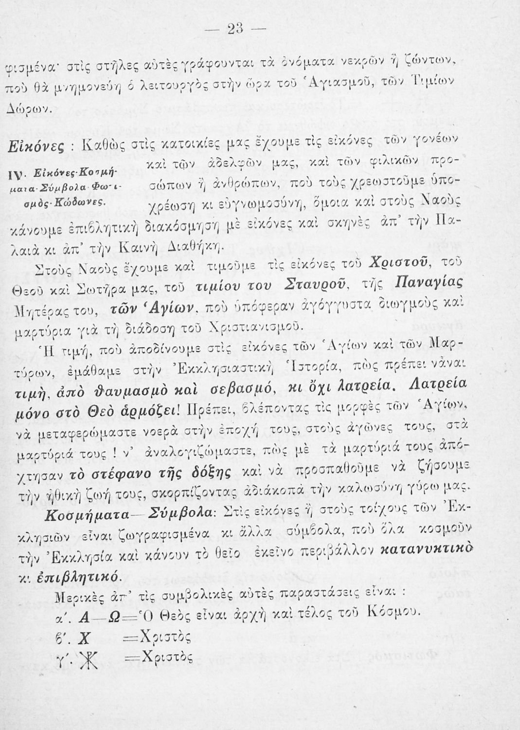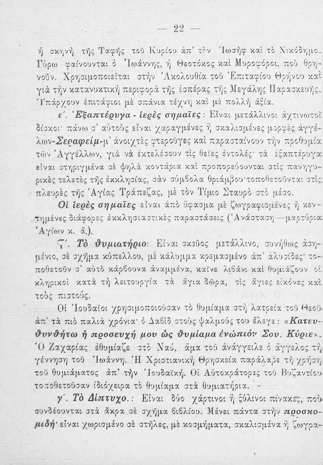 Παρουσίαση περιεχομένου: Το σύγγραμμα ήταν σχολικό εγχειρίδιο για το μαθήματα των Θρησκευτικών στο Δημοτικό. Περιγράφει σημαντικά γεγονότα της θρησκευτικής ζωής και μετά ασχολείται με τη λειτουργική εξετάζοντας κάθε τι που έχει σχέση με την πνευματική λατρεία του θεού. Επίσης, διαθέτει παράρτημα με τους βίους των Αγίων.