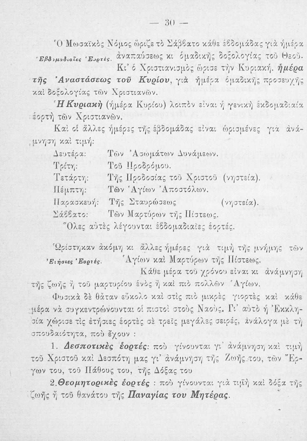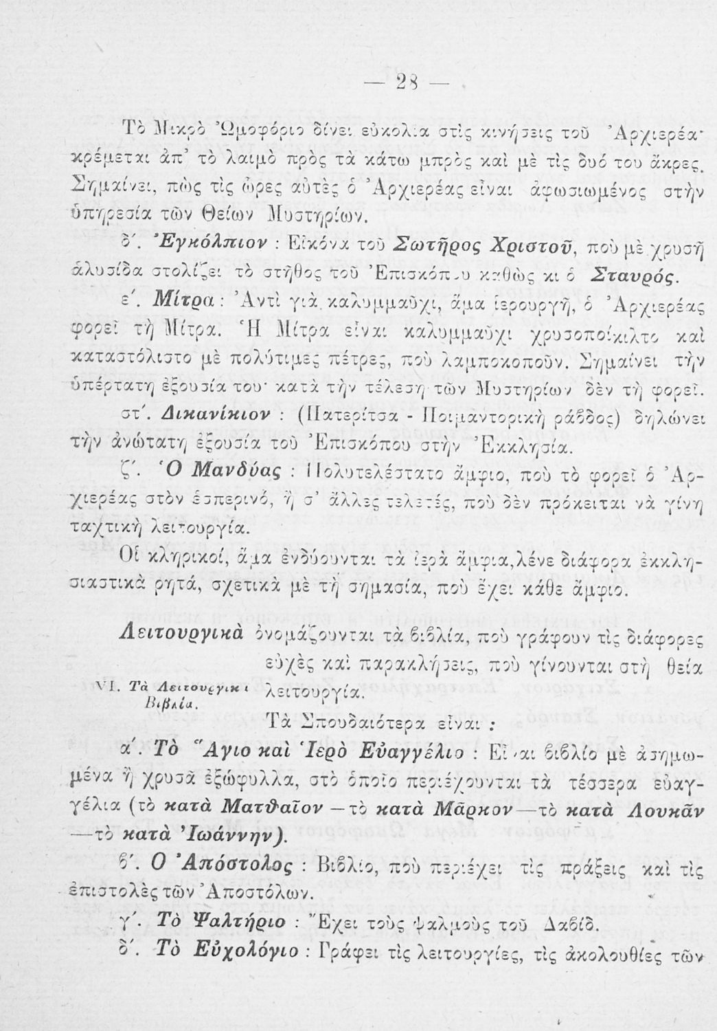 Το σύγγραμμα ήταν σχολικό εγχειρίδιο για το μαθήματα των Θρησκευτικών στο Δημοτικό. Περιγράφει σημαντικά γεγονότα της θρησκευτικής ζωής και μετά ασχολείται με τη λειτουργική εξετάζοντας κάθε τι που έχει σχέση με την πνευματική λατρεία του θεού. Επίσης, διαθέτει παράρτημα με τους βίους των Αγίων.