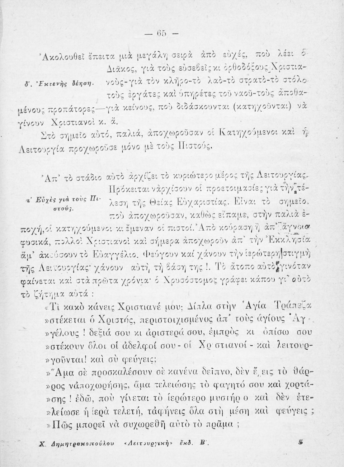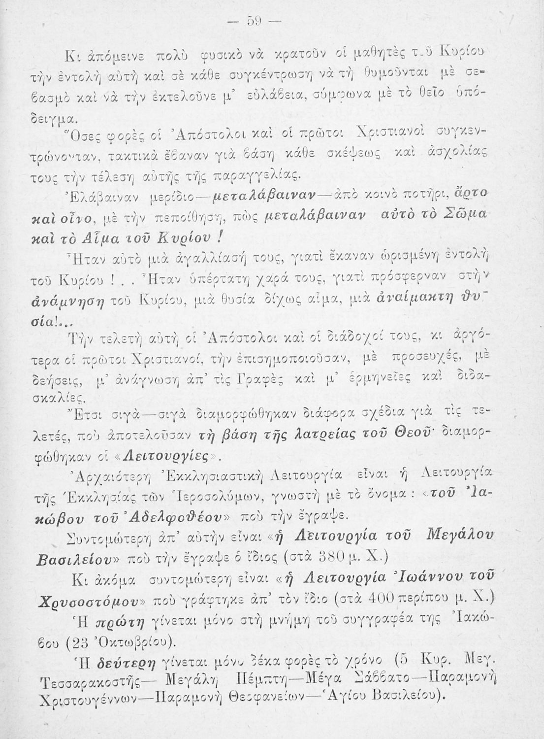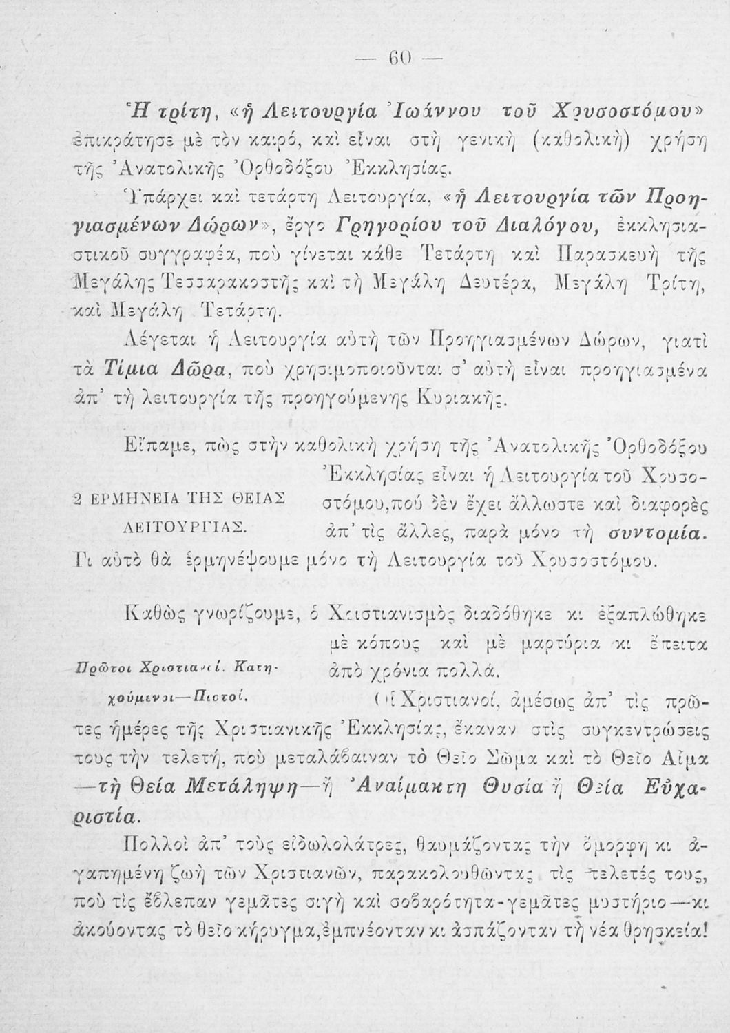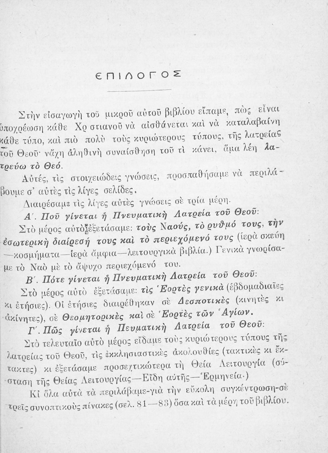 520 ## _aΤο σύγγραμμα ήταν σχολικό εγχειρίδιο για το μαθήματα των Θρησκευτικών στο Δημοτικό. Περιγράφει σημαντικά γεγονότα της θρησκευτικής ζωής και μετά ασχολείται με τη λειτουργική εξετάζοντας κάθε τι που έχει σχέση με την πνευματική λατρεία του θεού. Επίσης, διαθέτει παράρτημα με τους βίους των Αγίων.