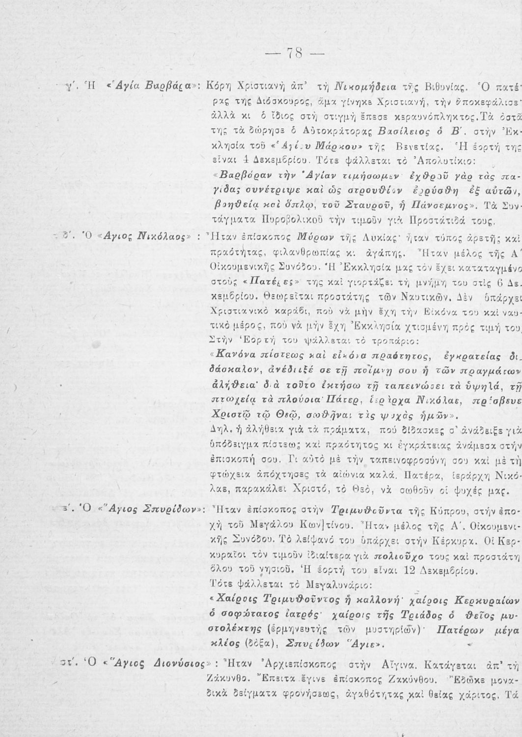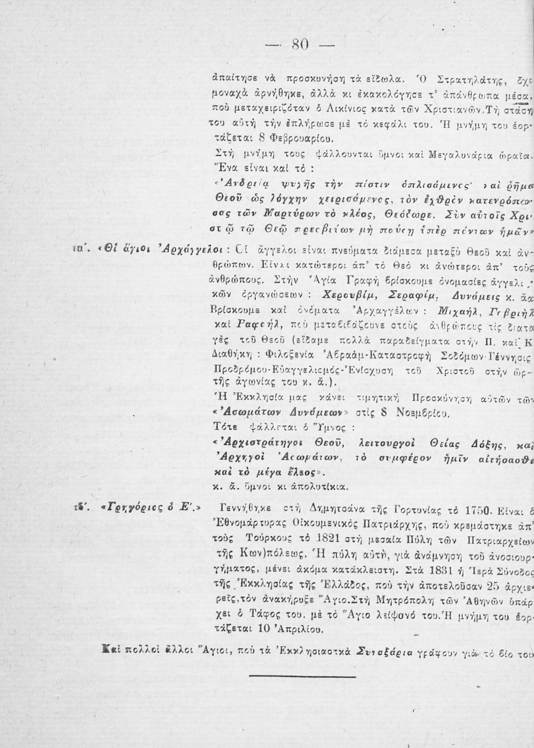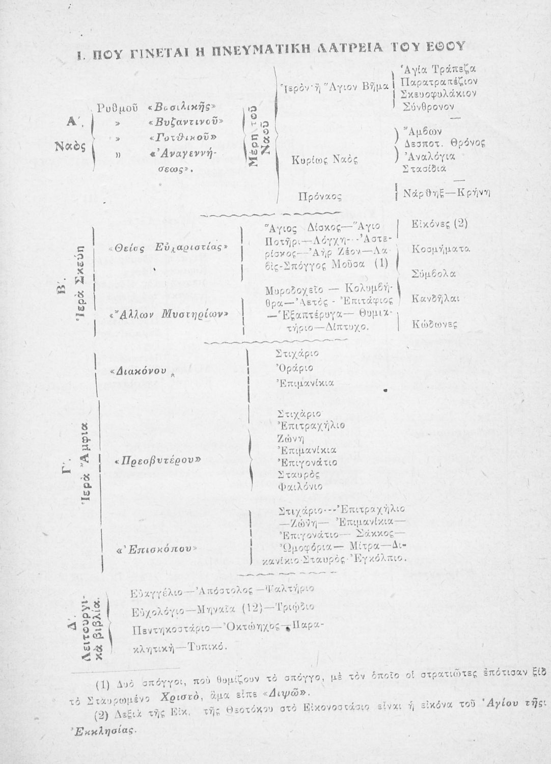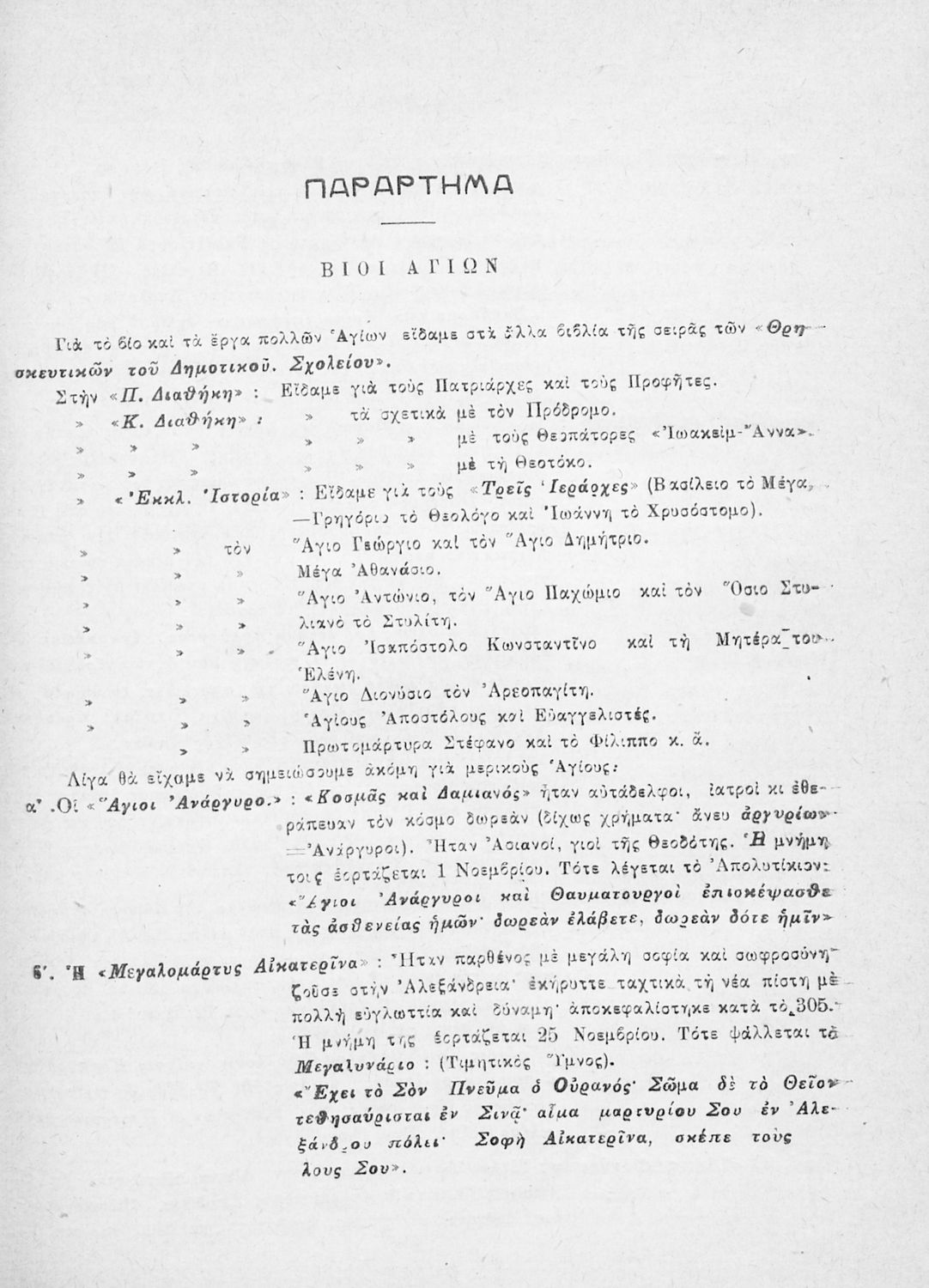 Παρουσίαση περιεχομένου: Το σύγγραμμα ήταν σχολικό εγχειρίδιο για το μαθήματα των Θρησκευτικών στο Δημοτικό. Περιγράφει σημαντικά γεγονότα της θρησκευτικής ζωής και μετά ασχολείται με τη λειτουργική εξετάζοντας κάθε τι που έχει σχέση με την πνευματική λατρεία του θεού. Επίσης, διαθέτει παράρτημα με τους βίους των Αγίων.