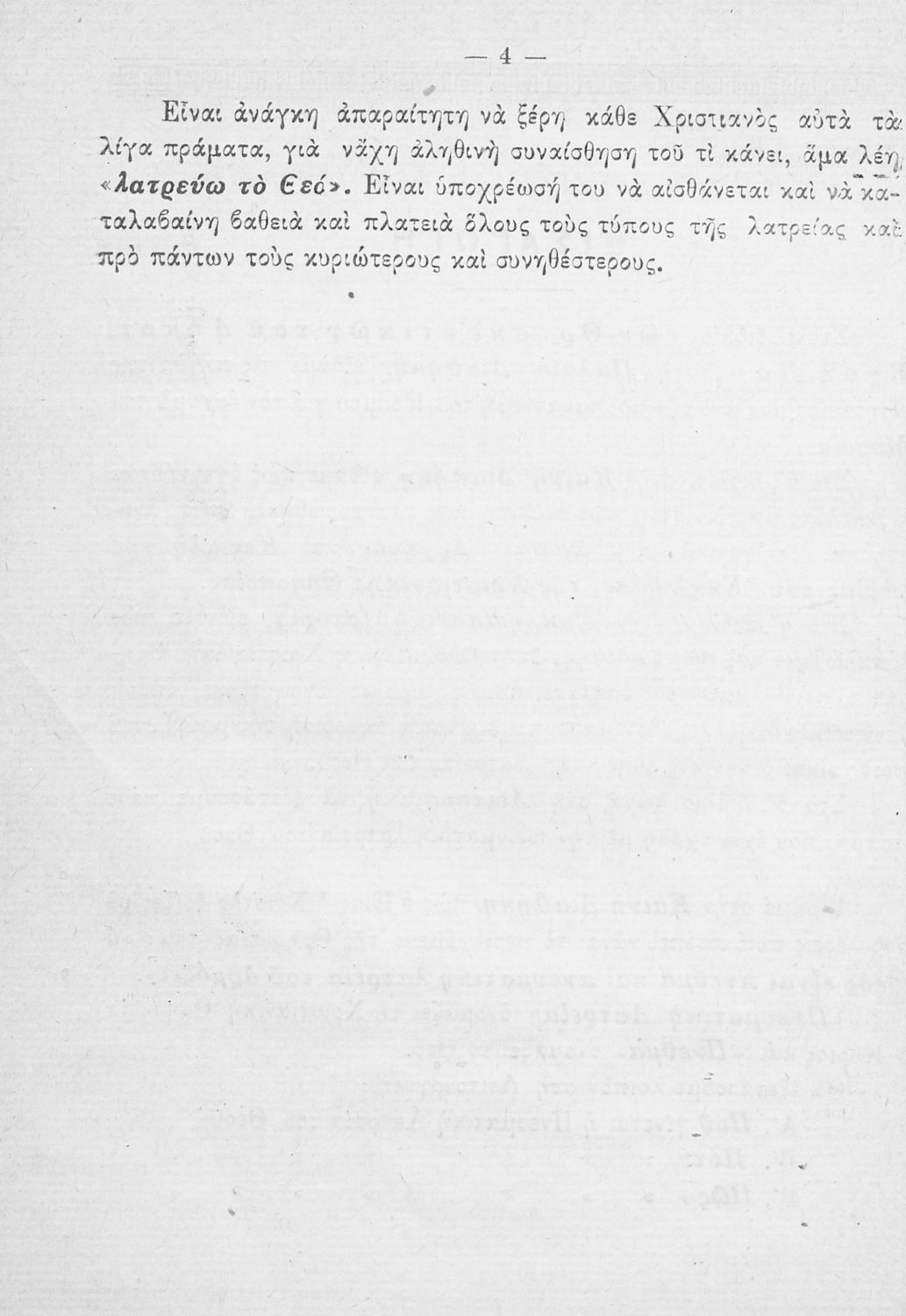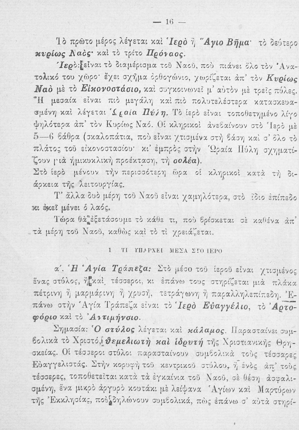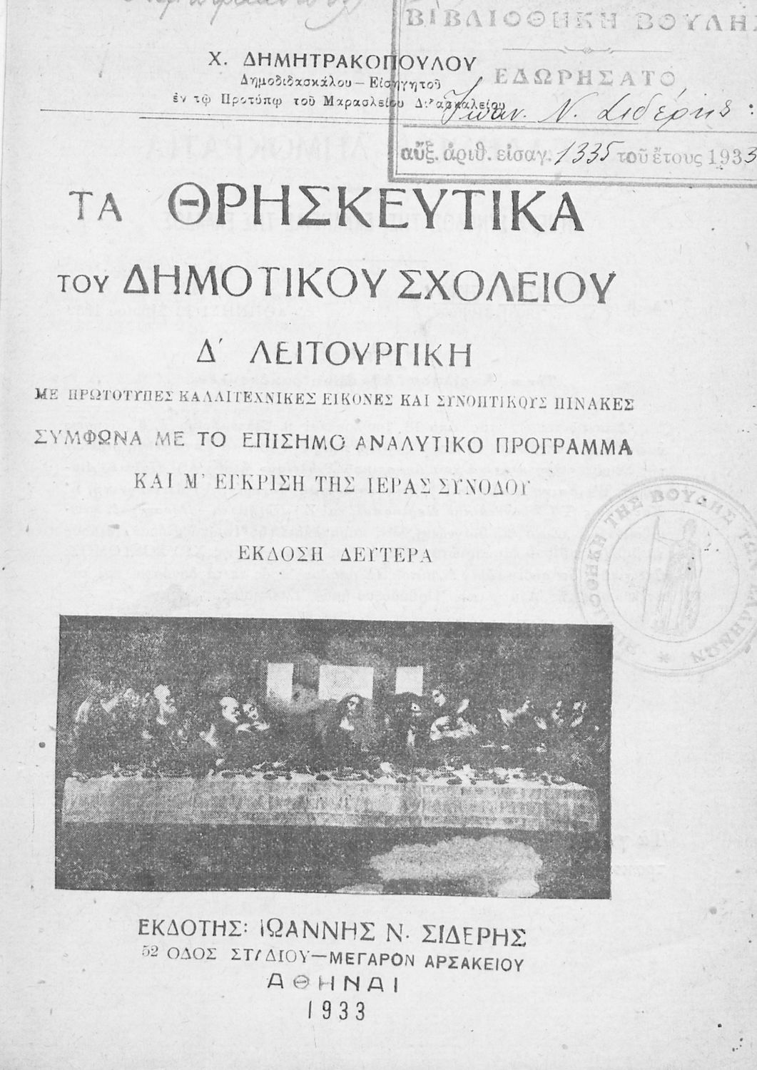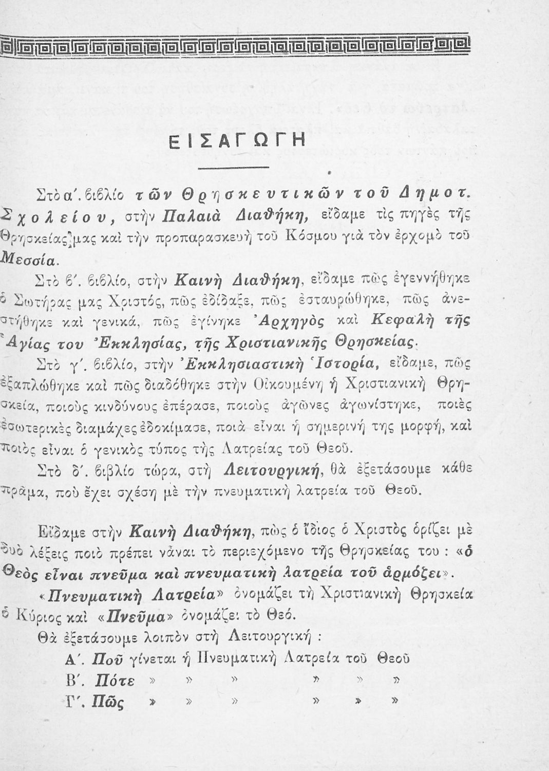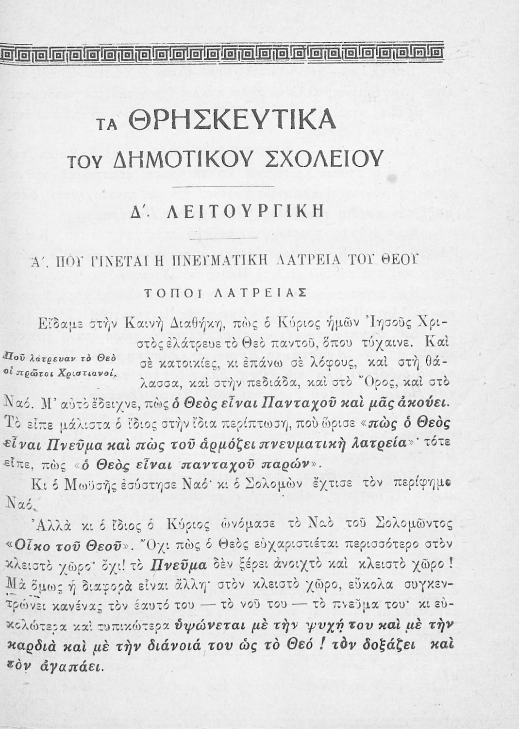 Βαθμίδα εκπαίδευσης: Πρωτοβάθμια Μάθημα: Θρησκευτικά Γλώσσα: Απλή καθαρεύουσα Παρουσίαση περιεχομένου: Το σύγγραμμα ήταν σχολικό εγχειρίδιο για το μαθήματα των Θρησκευτικών στο Δημοτικό. Περιγράφει σημαντικά γεγονότα της θρησκευτικής ζωής και μετά ασχολείται με τη λειτουργική εξετάζοντας κάθε τι που έχει σχέση με την πνευματική λατρεία του θεού. Επίσης, διαθέτει παράρτημα με τους βίους των Αγίων. |