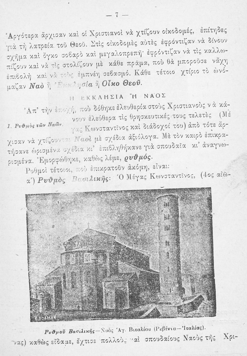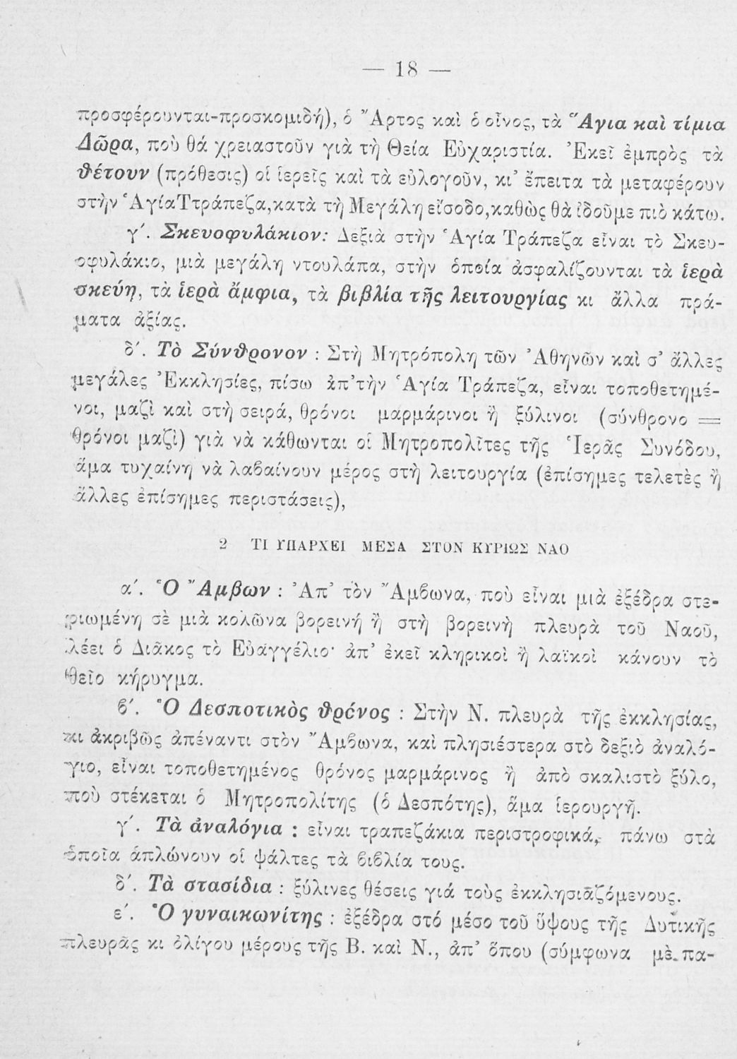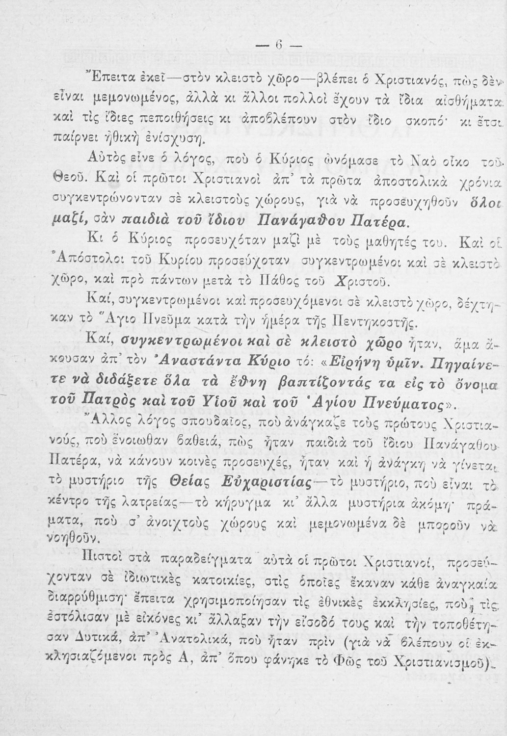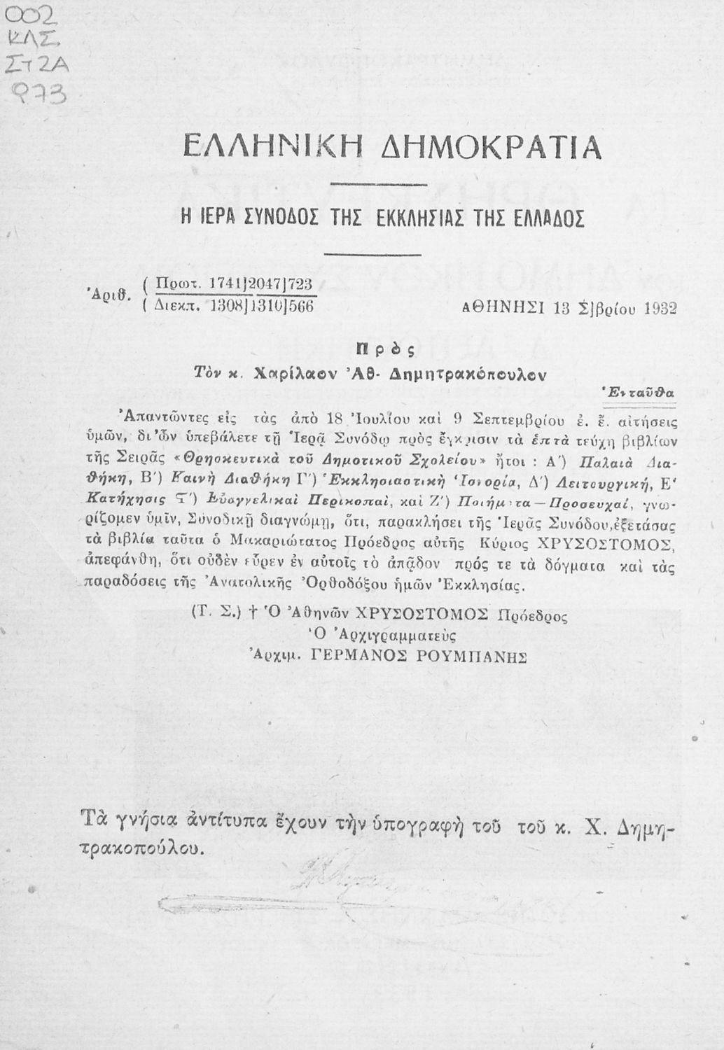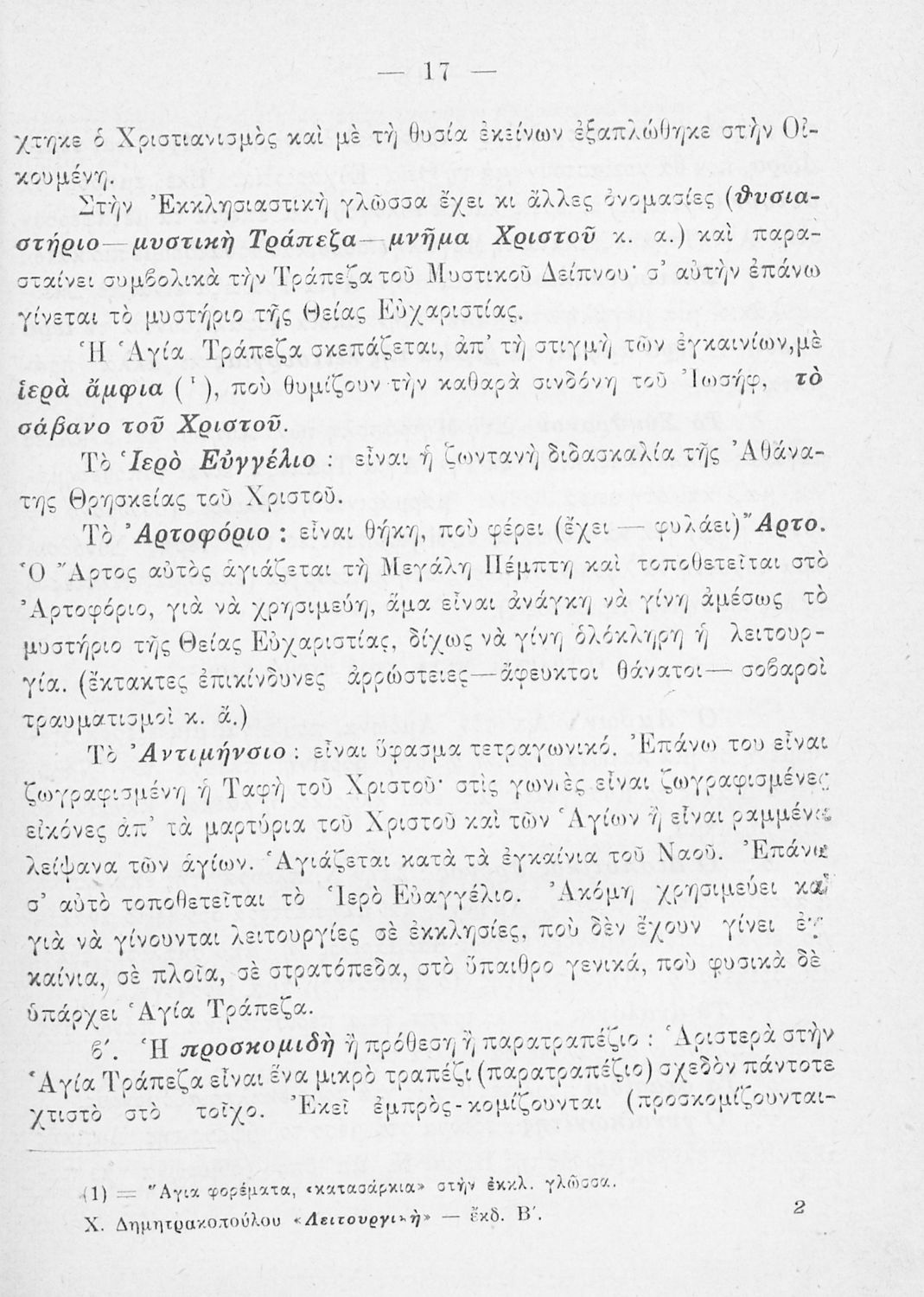 Βαθμίδα εκπαίδευσης: Πρωτοβάθμια Μάθημα: Θρησκευτικά Γλώσσα: Απλή καθαρεύουσα Παρουσίαση περιεχομένου: Το σύγγραμμα ήταν σχολικό εγχειρίδιο για το μαθήματα των Θρησκευτικών στο Δημοτικό. Περιγράφει σημαντικά γεγονότα της θρησκευτικής ζωής και μετά ασχολείται με τη λειτουργική εξετάζοντας κάθε τι που έχει σχέση με την πνευματική λατρεία του θεού. Επίσης, διαθέτει παράρτημα με τους βίους των Αγίων. |