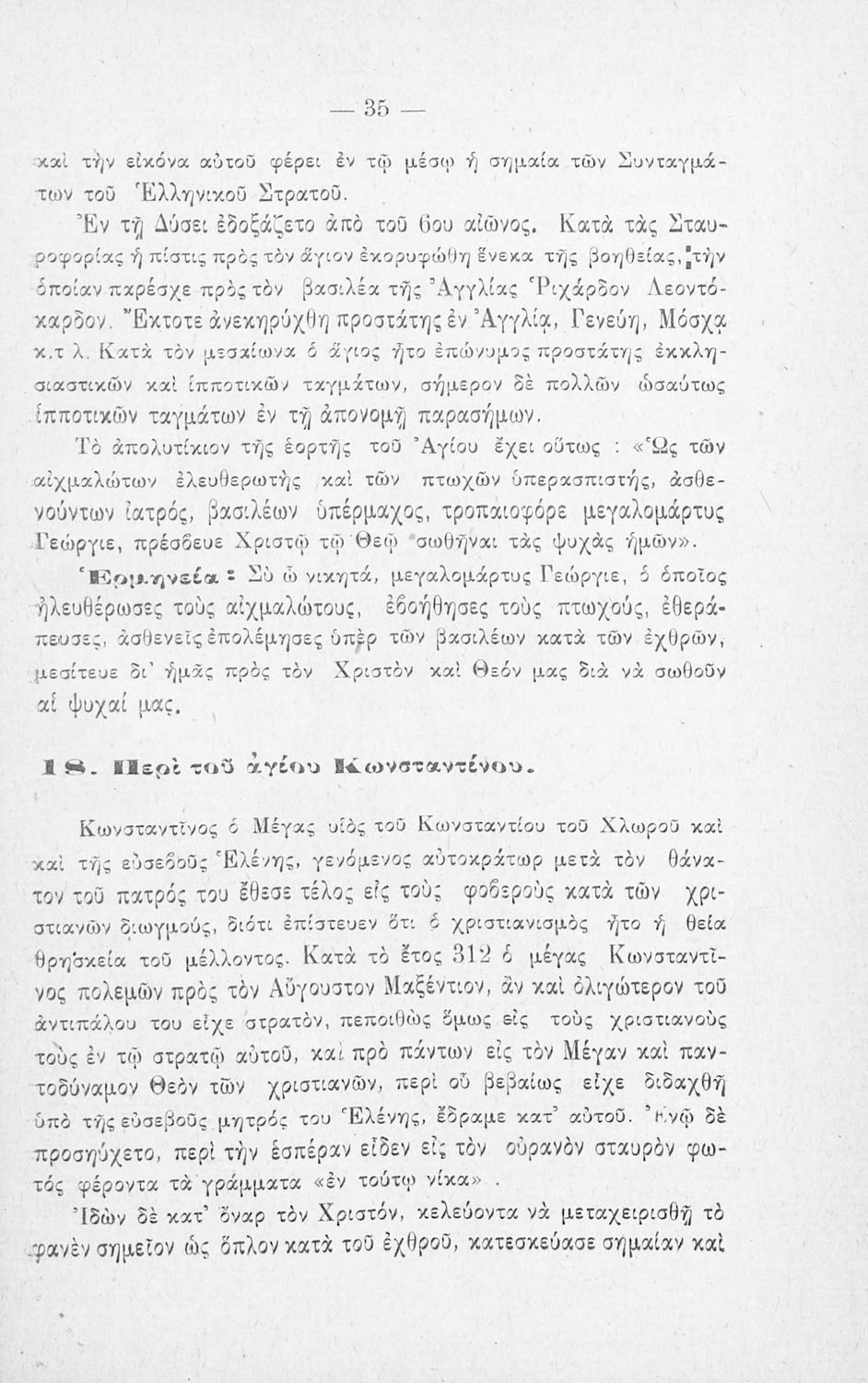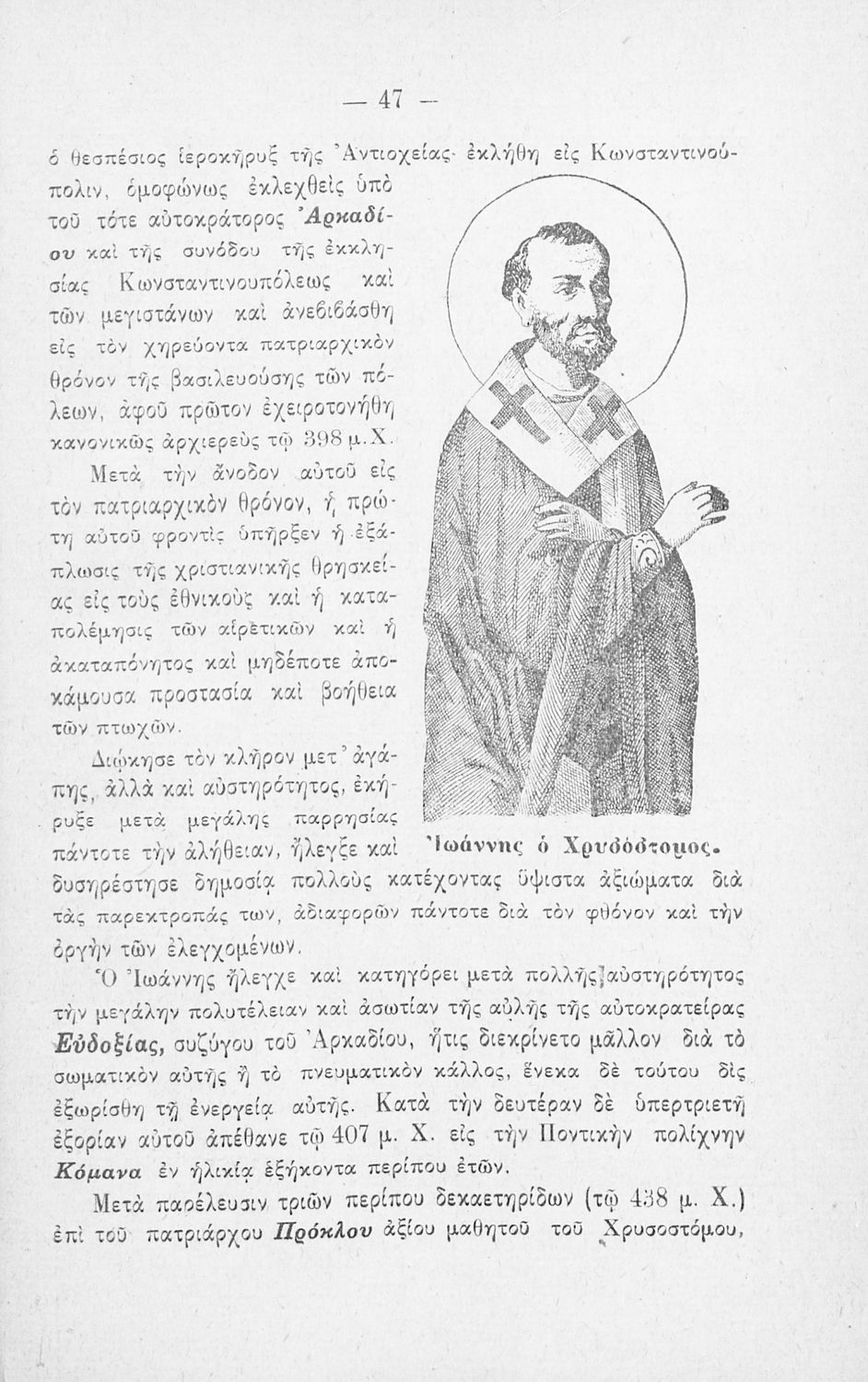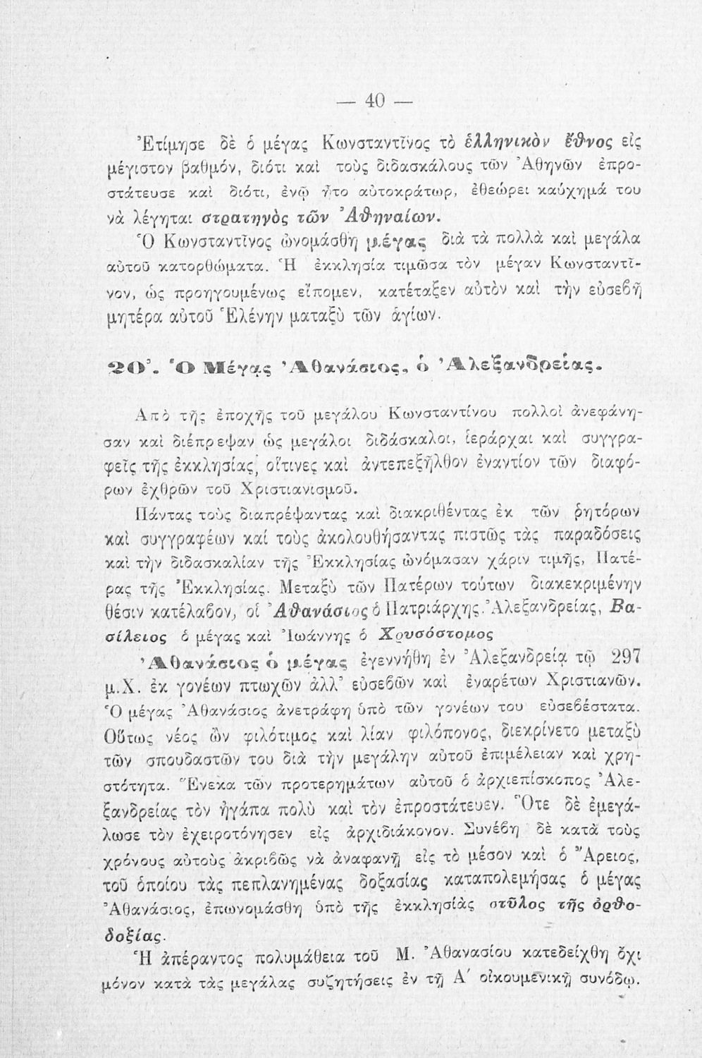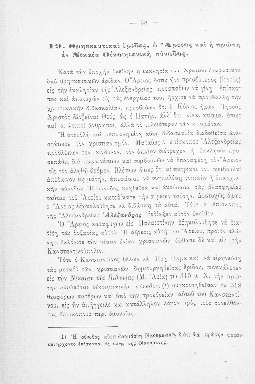 Το σύγγραμμα ήταν σχολικό εγχειρίδιο για το μαθήματα των Θρησκευτικών. Περιγράφει σημαντικά γεγονότα της θρησκευτικής ζωής ξεκινώντας από την Πεντηκοστή. Επίσης, αναφέρεται σε θέματα διοίκησης της εκκλησίας και τα άλλα Πατριαρχεία.