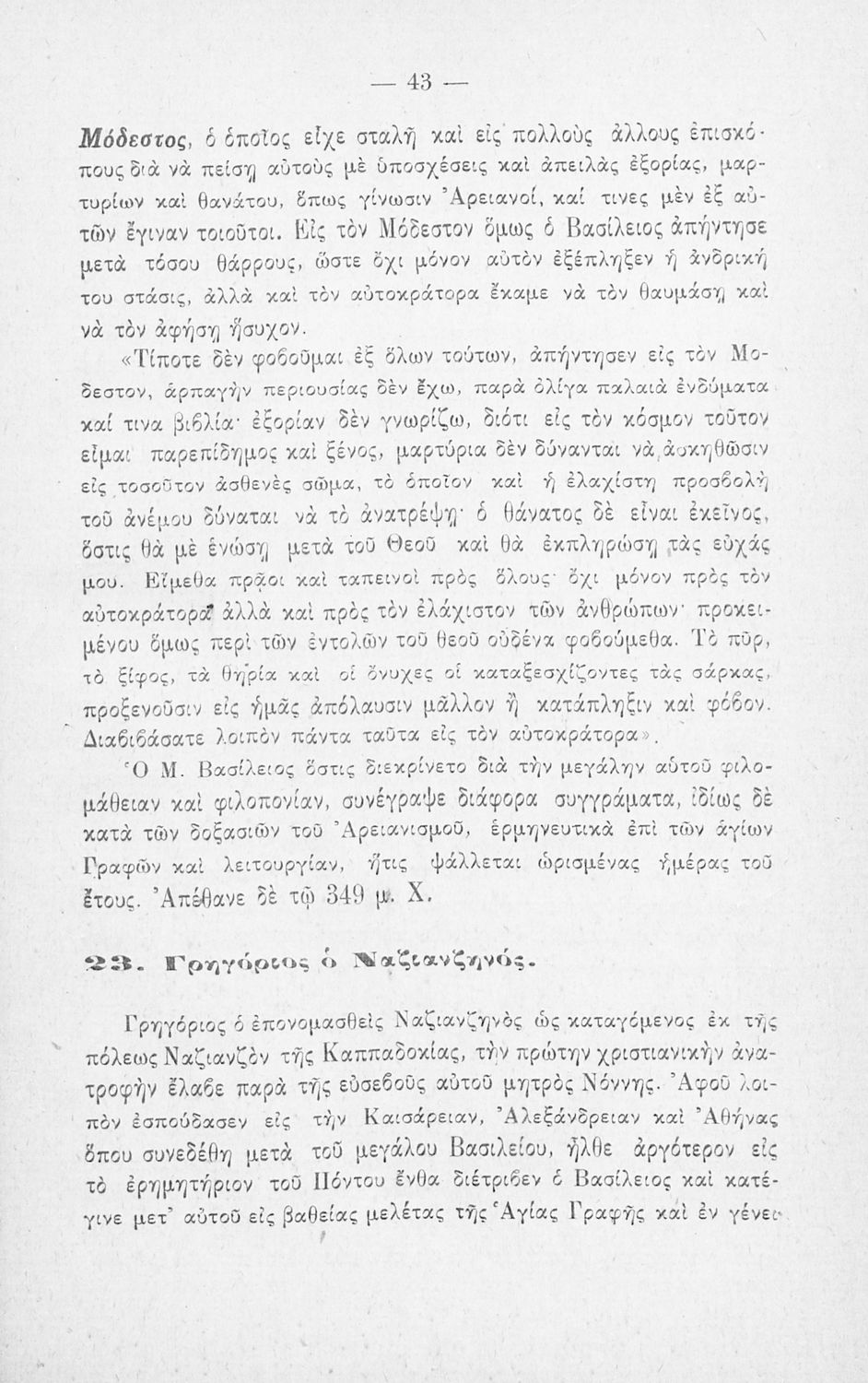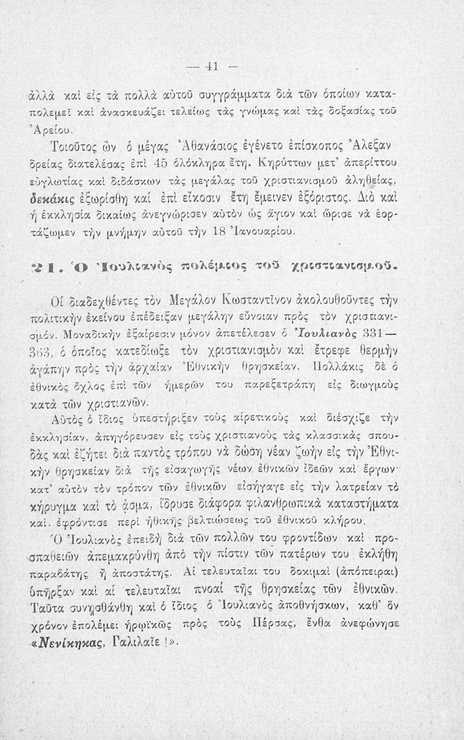 Παρουσίαση περιεχομένου: Το σύγγραμμα ήταν σχολικό εγχειρίδιο για το μαθήματα των Θρησκευτικών. Περιγράφει σημαντικά γεγονότα της θρησκευτικής ζωής ξεκινώντας από την Πεντηκοστή. Επίσης, αναφέρεται σε θέματα διοίκησης της εκκλησίας και τα άλλα Πατριαρχεία.