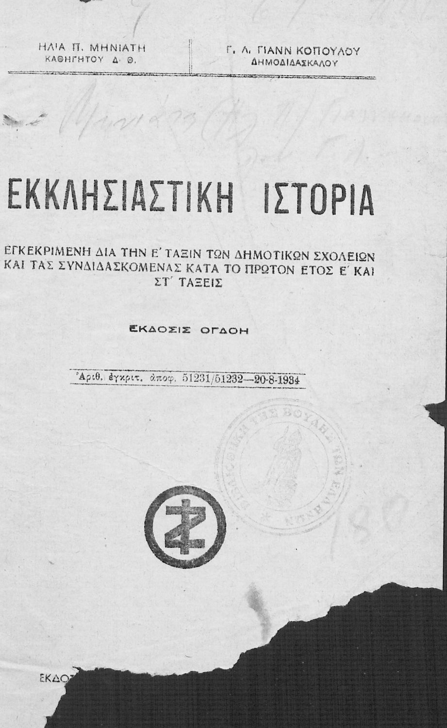 Σχολικό εγχειρίδιο Θρησκευτικών Ε΄ Δημοτικού που αποτελεί μια ιστορική επισκόπηση της Ορθόδοξης Εκκλησίας από την ίδρυσή της μέχρι την ίδρυση της Εκκλησίας της Ελλάδας. Φέρει το σύμβολο της δικτατορίας.