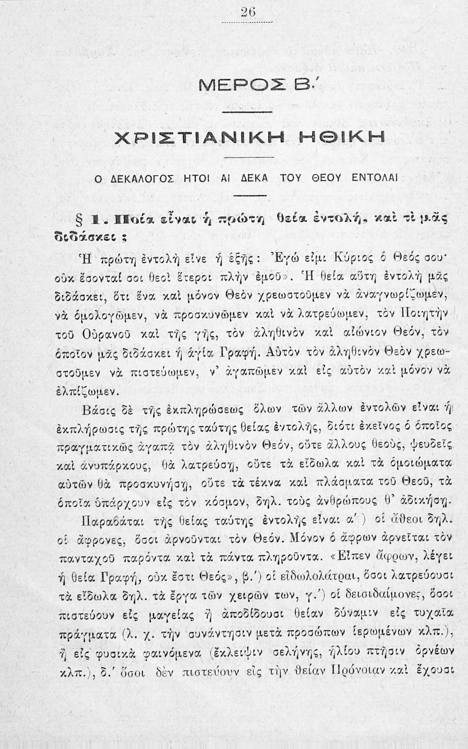 Σχολικό εγχειρίδιο Θρησκευτικών για τους μαθητές των Δημοτικών και των Αστικών σχολείων. Το βιβλίο αναφέρεται στη χριστιανική κατήχηση και τη χριστιανική ηθική. Παρουσιάζει τα μυστήρια του χριστιανισμού μέσω των οποίων μυούνται οι πιστοί, όπως η βάπτιση, ο γάμος και η μετάνοια. Στη συνέχεια αναφέρεται στους κώδικες αξιών στους οποίους βασίζεται η χριστιανική ηθική.