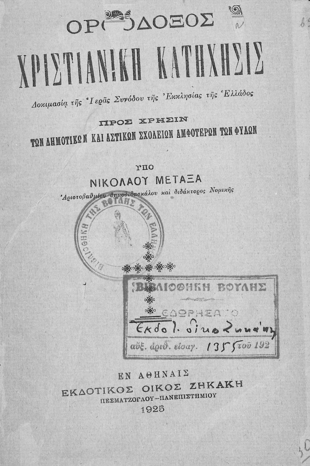 Εκδότης: Ζηκάκης Έτος έκδοσης: 1925 Τόπος έκδοσης: Αθήνα Υπουργική απόφαση / Σύμβαση: 9628/9-6-1904 Έτος έγκρισης: 1904 |