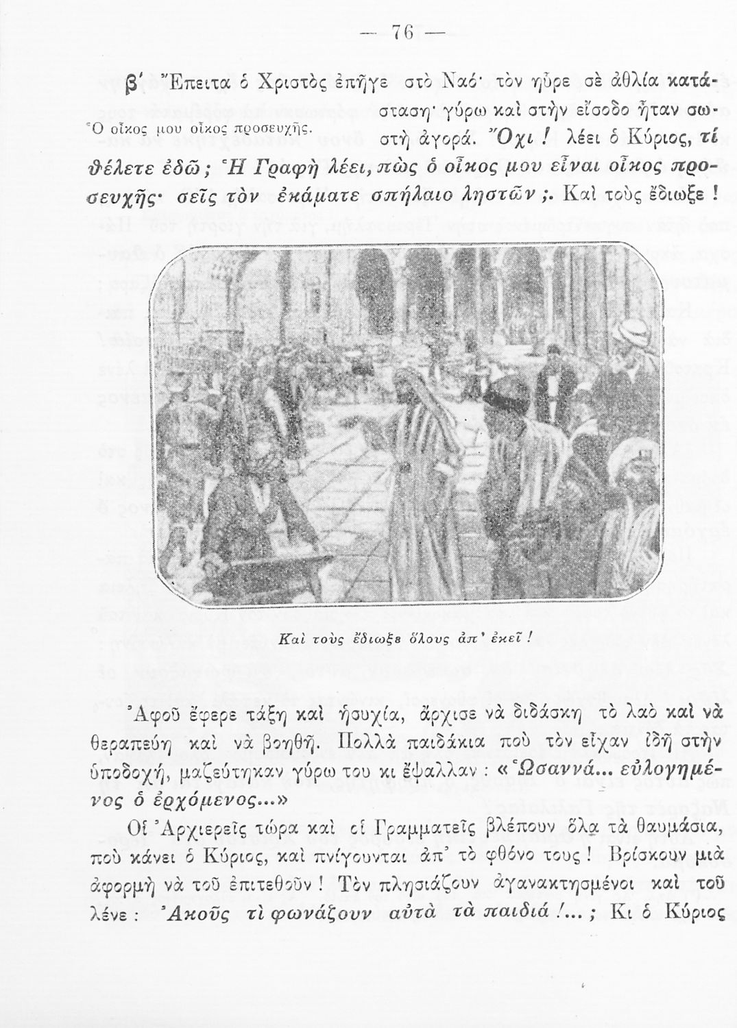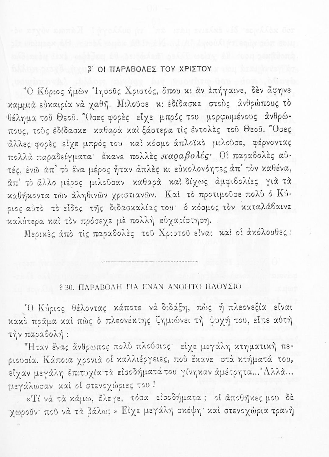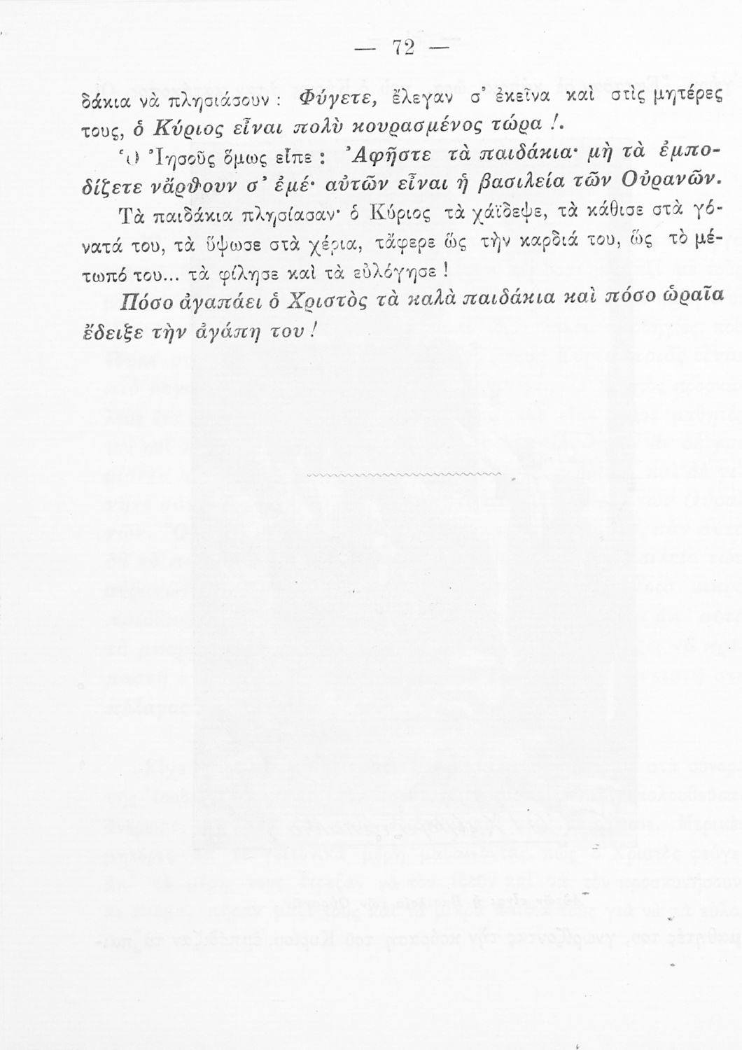 Το σύγγραμμα ήταν σχολικό εγχειρίδιο για το μαθήματα των Θρησκευτικών στο Δημοτικό. Περιγράφει σημαντικά γεγονότα της θρησκευτικής ζωής ξεκινώντας με την Καινή Διαθήκη. Το βιβλίο καλύπτει τα χρόνια του Ιησού Χριστού, τον ηθικό βίο του, που αποτελεί υπόδειγμα για τους Χριστιανούς.