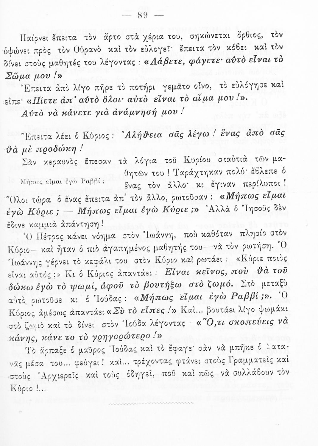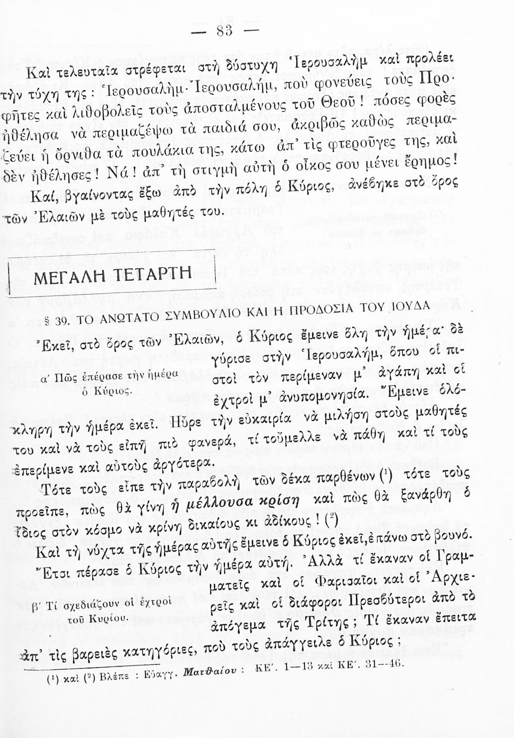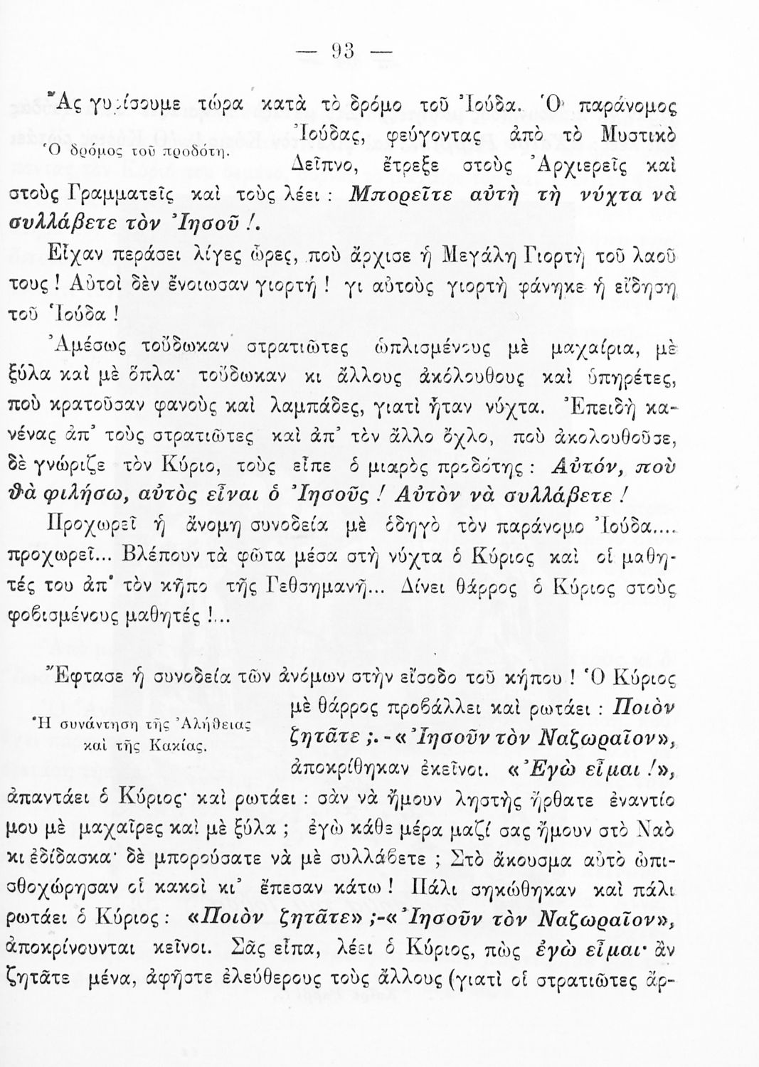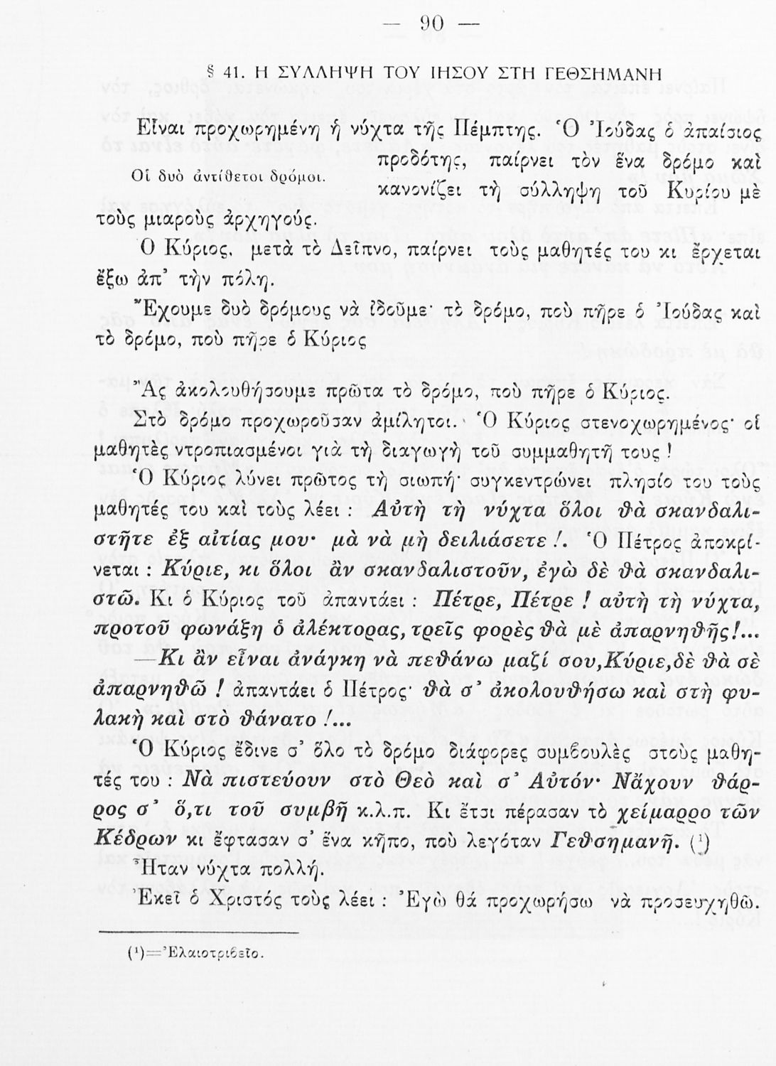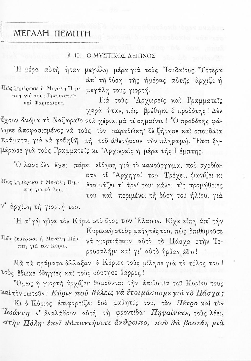 Το σύγγραμμα ήταν σχολικό εγχειρίδιο για το μαθήματα των Θρησκευτικών στο Δημοτικό. Περιγράφει σημαντικά γεγονότα της θρησκευτικής ζωής ξεκινώντας με την Καινή Διαθήκη. Το βιβλίο καλύπτει τα χρόνια του Ιησού Χριστού, τον ηθικό βίο του, που αποτελεί υπόδειγμα για τους Χριστιανούς.