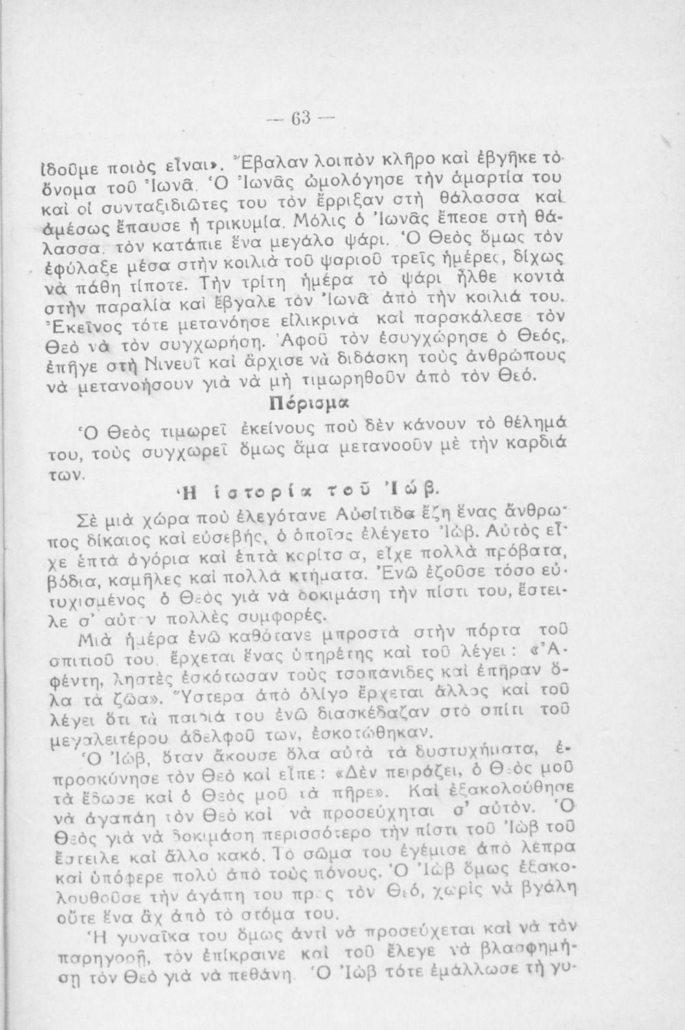 Βαθμίδα εκπαίδευσης: Πρωτοβάθμια Τάξη: Γ' Δημοτικού Μάθημα: Θρησκευτικά Γλώσσα: Δημοτική με στοιχεία καθαρεύουσας Παρουσίαση περιεχομένου: Μαθητικό βοήθημα Θρησκευτικών Γ΄ Δημοτικού που συνιστά μία εξιστόρηση της Παλαιάς Διαθήκης από τη δημιουργία του κόσμου ως τους Προφήτες. |
