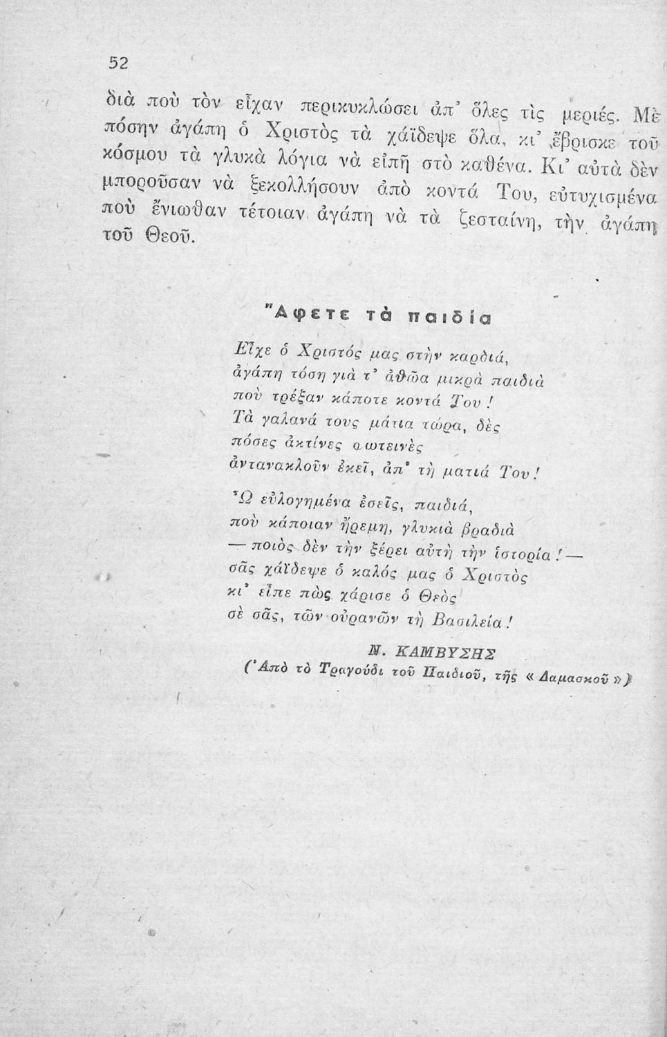 Σχολικό εγχειρίδιο Νέων Ελληνικών Δ΄ Γυμνασίου Θηλέων που περιλαμβάνει πεζά, ποιήματα και δημοτικά τραγούδια εμπνευσμένα από την σύγχρονη ελληνική ιστορία και την οικογενειακή και θρησκευτική ζωή. Περιέχει και