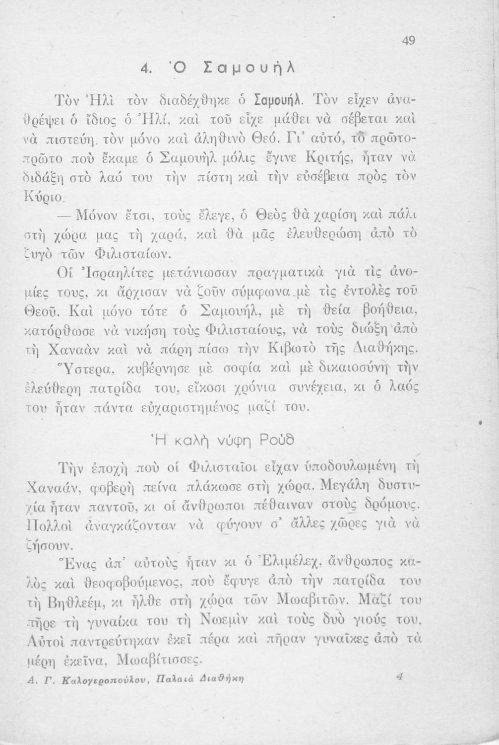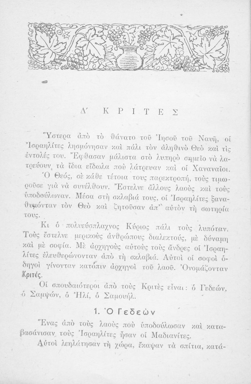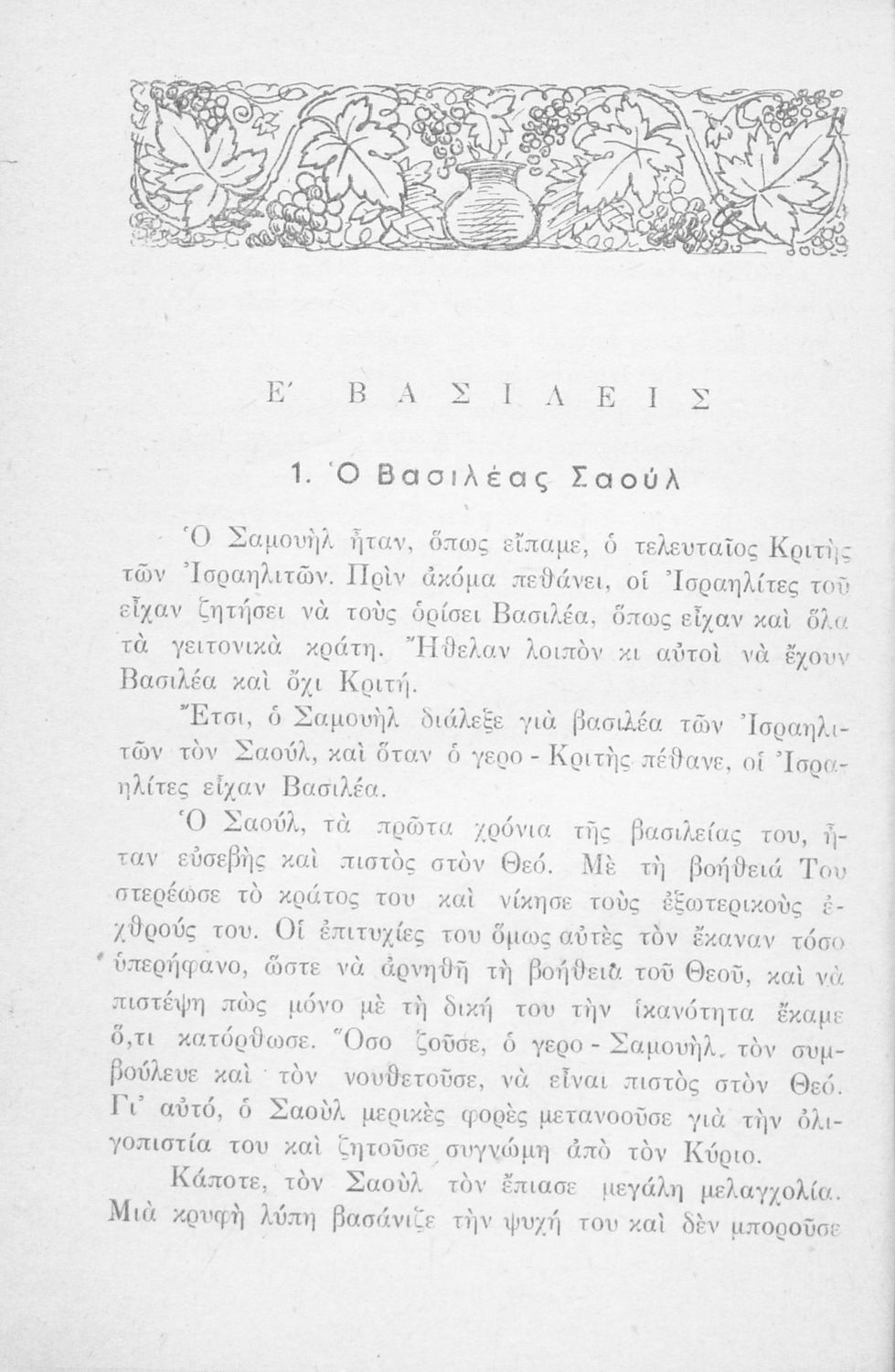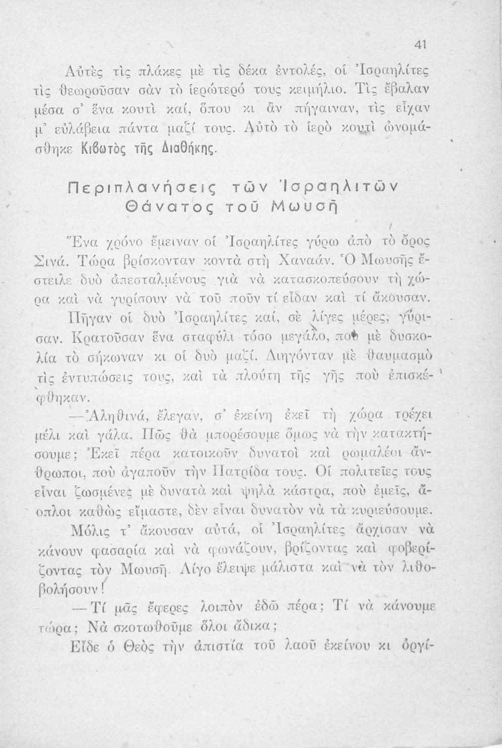 Σχολικό εγχειρίδιο για την Γ΄ Τάξη πιθανόν της Εκκλησιαστικής Γεωργικής Σχολής. Αναφέρεται στα γεγονότα της Παλαιάς Διαθήκης. Περιέχει τη δράση του Ιακώβ, του Μωυσή, μέχρι και τους προφήτες.
