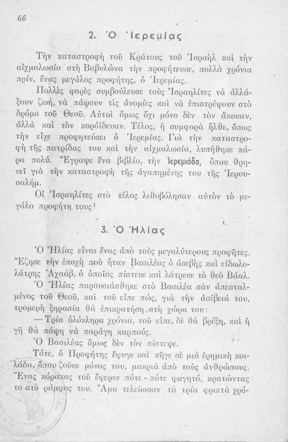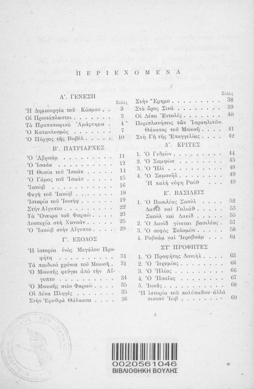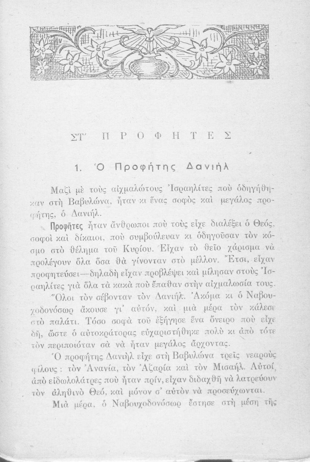 Σχολικό εγχειρίδιο για την Γ΄ Τάξη πιθανόν της Εκκλησιαστικής Γεωργικής Σχολής. Αναφέρεται στα γεγονότα της Παλαιάς Διαθήκης. Περιέχει τη δράση του Ιακώβ, του Μωυσή, μέχρι και τους προφήτες.